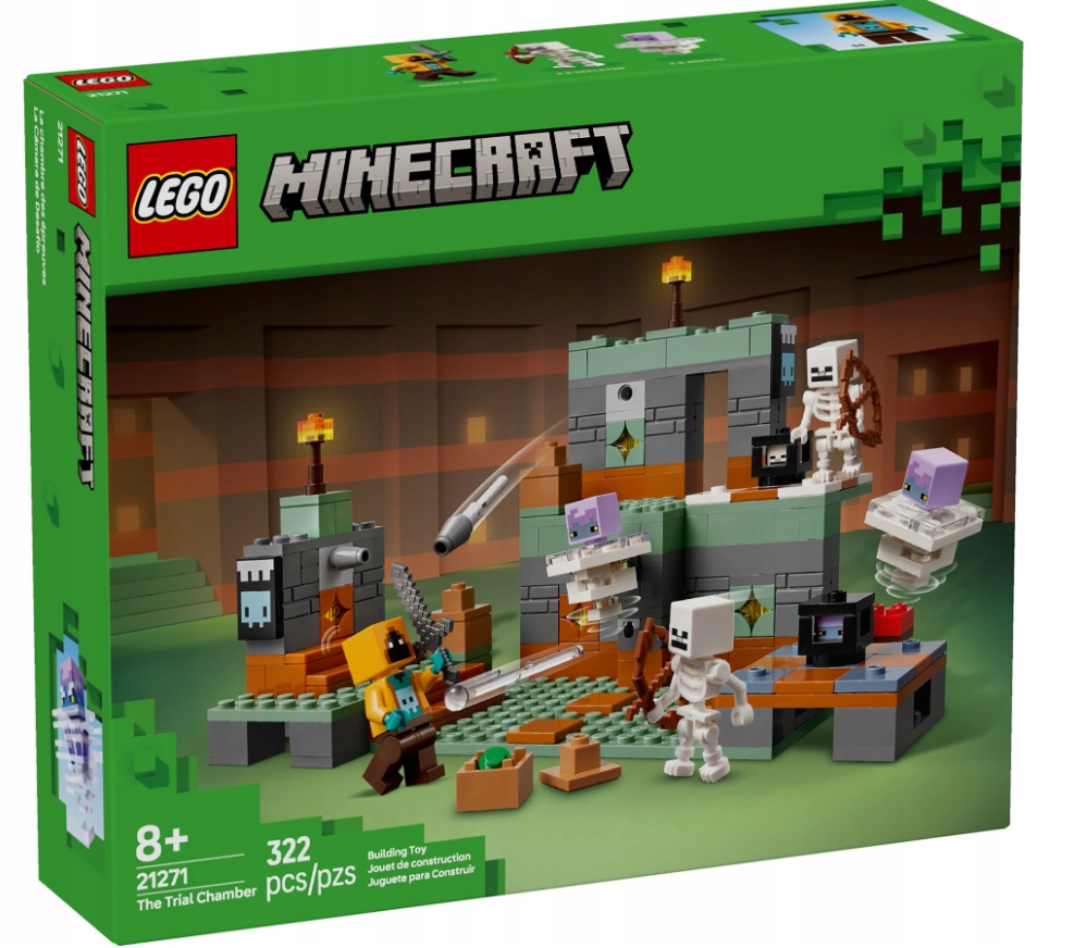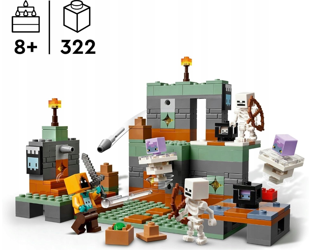Этот творческий набор включает в себя камеру образцов из Minecraft, две скелетные фигуры, две статуэтки настольных моб, минифигура в тонком капюшоне и два спавня. Кроме того, он включает в себя два снимка пули - по одному на каждой стене - и пружинную пулю с спуском за задней стеной. В трех горшках вы можете найти сокровища в виде изумруда или алмаза. Еще больше веселья предоставляется комнатой в задней части набора, оборудованного кроватью и столом. Приложение Lego Builder обеспечит цифровое развлечение, в котором дети могут увеличивать и вращать модели в 3D и отслеживать их прогресс.