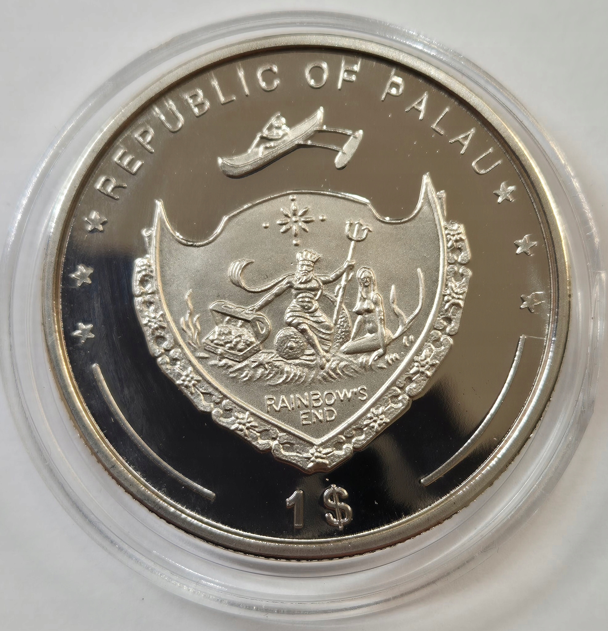 Аверс: Герб Палау с надписью REPUBLIC OF PALAU, изображающей морскую богиню, сундук с сокровищами и трезубец. Над щитом изображена долбленая каноэ с гребцом – элемент культурной символики островов Тихого океана. Внизу номинал: 1$.