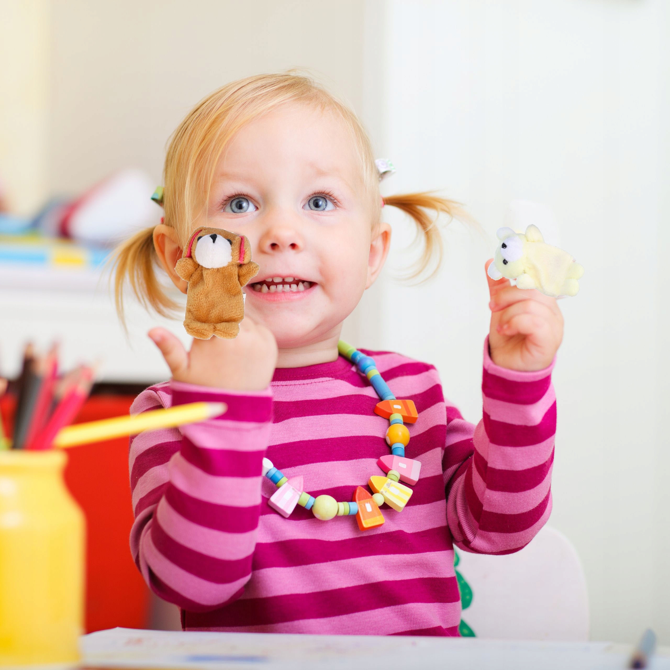 Десять разных кукол, от бегемота до коровы, гарантируют, что каждый ребенок найдет свое любимое животное для игры. Если дать детям возможность использовать все пальцы для анимации этих маленьких друзей, это открывает двери для бесконечных историй и игр.