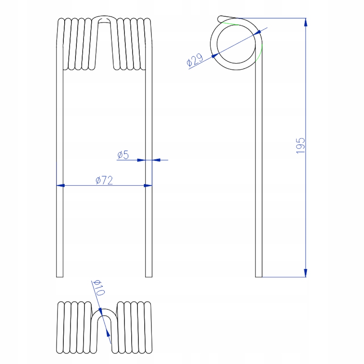 <р> Толщина проволоки: 5 мм <р> Внутренний диаметр: 29 мм <р> Ширина: 72 мм <р> Общая длина: 195 мм <р> Монтажная ширина: 10 мм <р> Точные размеры указаны на прилагаемой схеме в фотогалерееПружина пальца подборщика John Deere CC32965 195 мм, применение: