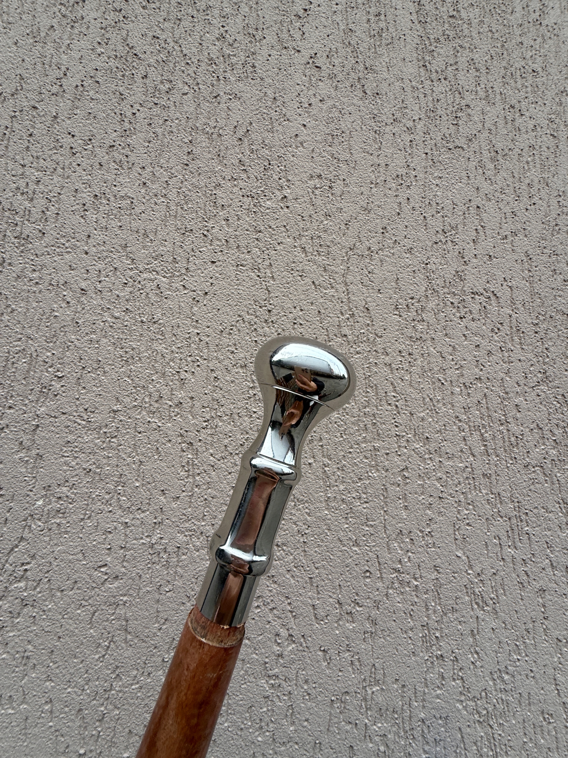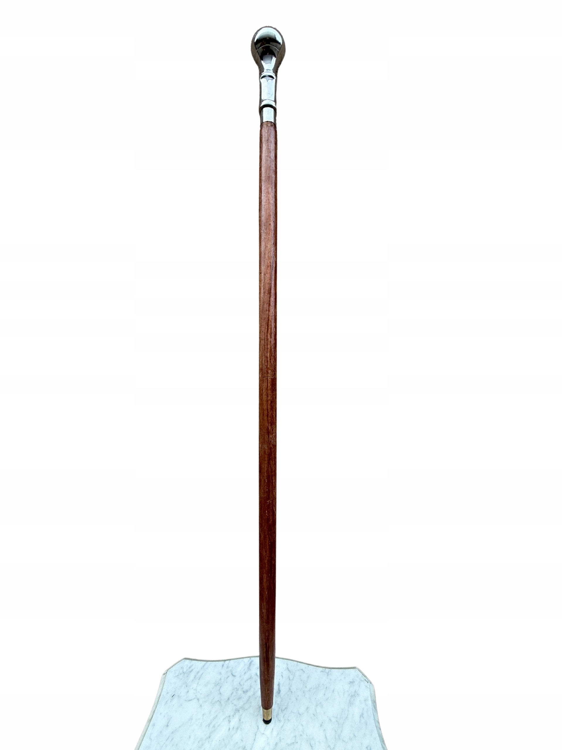 ПАЛКА С ШАРИКОМ И ЛАТУННОЙ РУЧКОЙ, ДЕРЕВЯННАЯ, СЕРЕБРИСТО-КОРИЧНЕВАЯ.