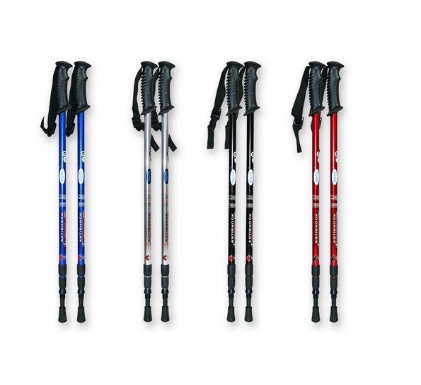 Классические треккинговые палки различных цветов. Он изготовлен из легкого алюминиевого сплава и имеет складную (телескопическую) конструкцию. Длину шеста ANTISHOCK можно регулировать от 85 до 110 см. Рукоятки изготовлены из прочной резины, которая идеально адаптируется к форме руки, обеспечивая надежный и крепкий хват. Дополнительно, чтобы палка не выпадала из руки, к рукоятке прикреплена петля на запястье. Легкая и гибкая конструкция палки прекрасно снимает нагрузку с коленей во время длительных прогулок и восхождений на вершины. Его размеры в сложенном виде составляют 60 см.