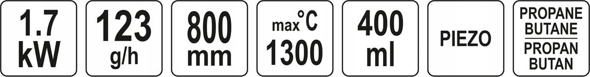 Технические данные: Общий вес (кг): 2,4170 Длина копья: около 80 см. Горелка со стальным соплом: диаметром 30 мм.Горелка для сжигания сорняков. Горелка со стальным соплом диаметром 30 мм. Стальное копье общей длиной около 80 см. Регулировка подачи газа с помощью ручки. Горелка крепится к вставному баллону с помощью ручки, фиксирующей зажим баллона. На копье установлен пьезоэлектрический воспламенитель.Назначение/применениеГорелка для легкого и эффективного удаления сорняков. Особенно полезно в местах, где мы не косим косилкой, например, рядом с заборами, на дорожках между камнями и т. д.**