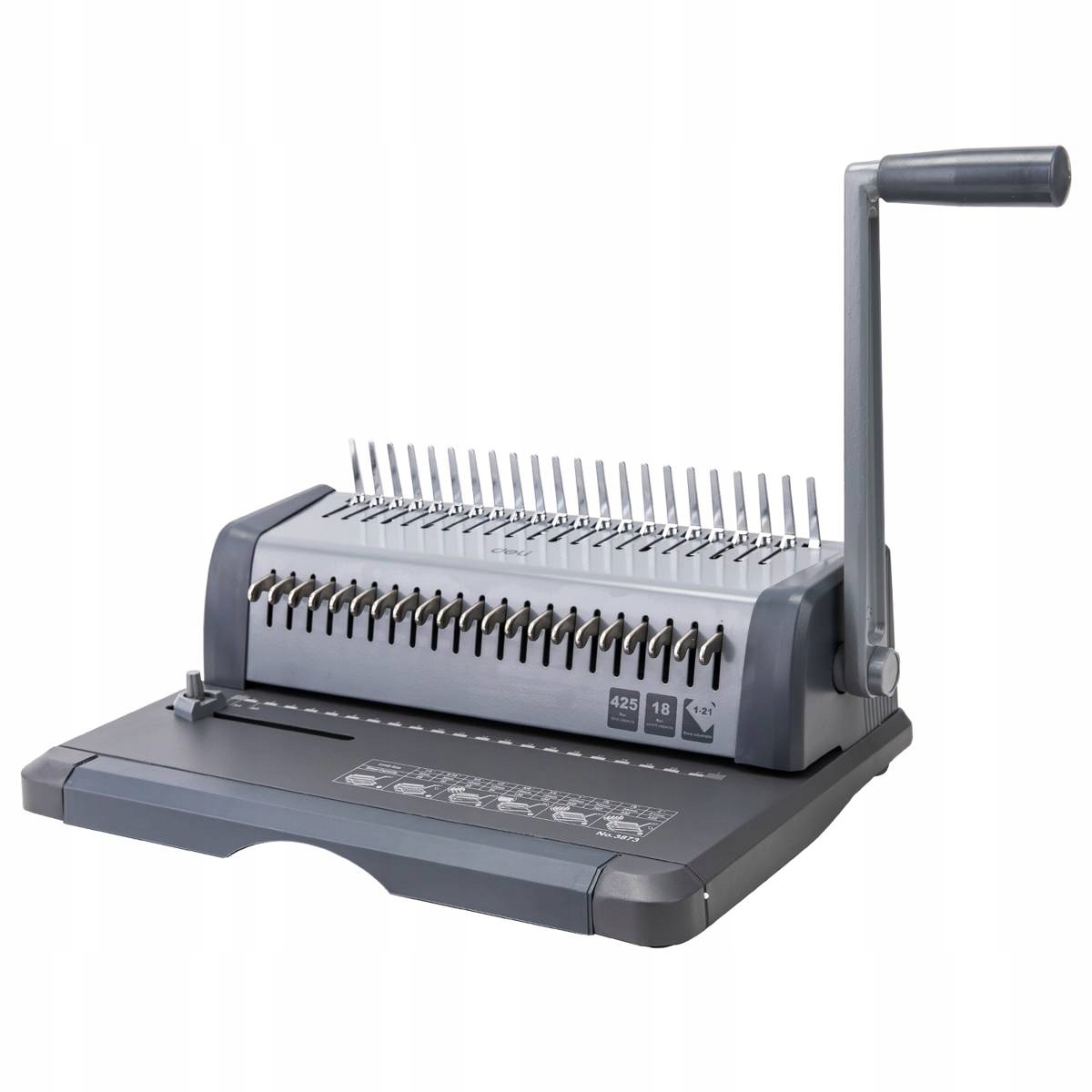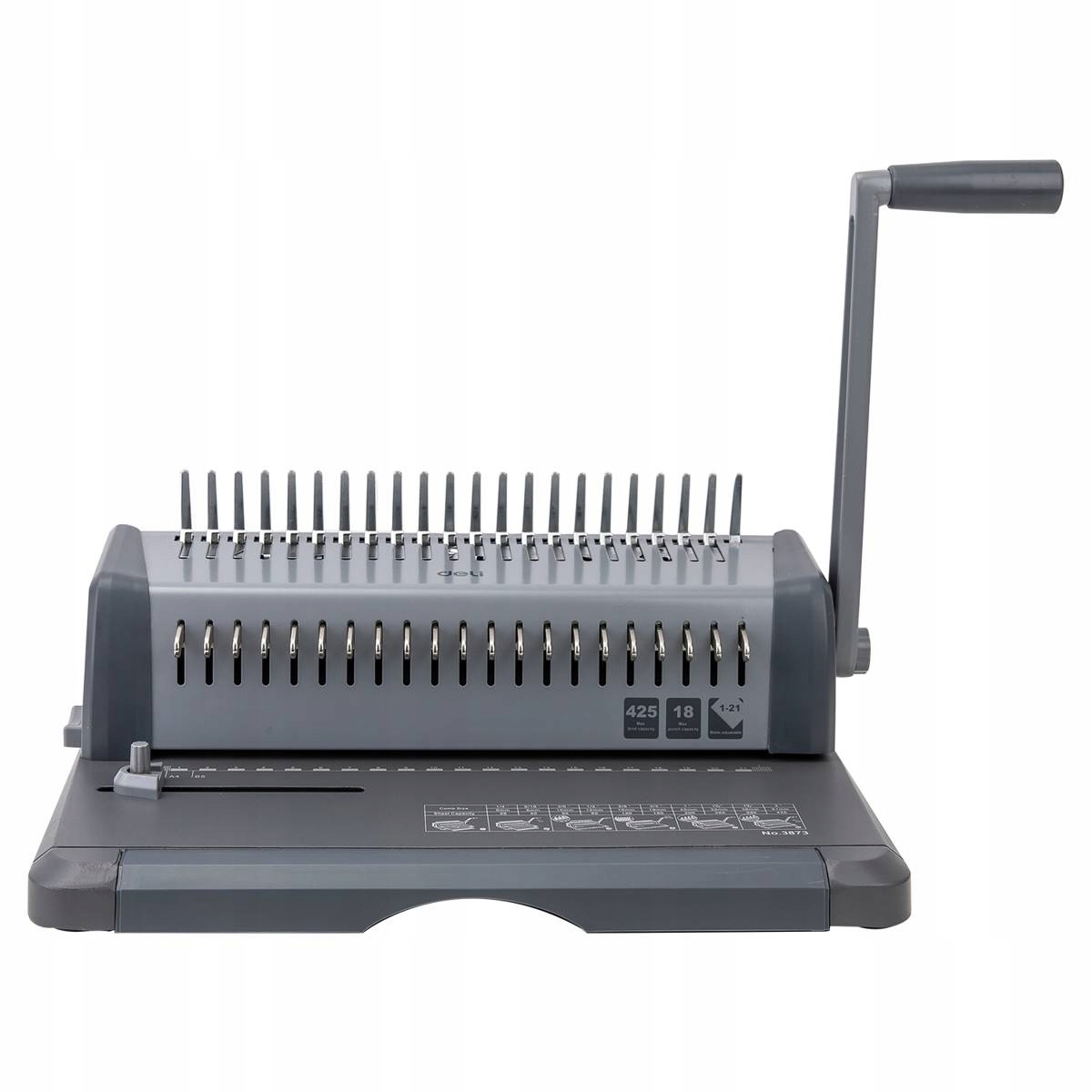 Переплетная машина Deli E3873 позволяет скреплять листы бумаги максимального формата А4. С его помощью можно проделать от 1 до 21 отверстия одновременно на 18 листах бумаги. Также есть возможность регулировать поля. Устройство позволяет скреплять до 425 листов бумаги. Он оснащен специальным баком для отходов и невероятно прост в использовании.