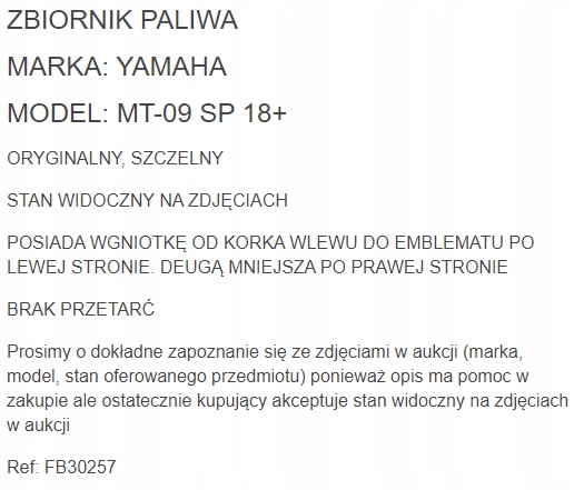Просматривая «ТОПЛИВНЫЙ БАК YAMAHA MT 09 SP 900 MT09 SP 18 +», вы можете быть уверены, что данный товар из каталога «Топливные баки» будет доставлен из Польши и проверен на целостность. В цене товара, указанной на сайте, учтена доставка из Польши. Внимание!!! Товары для Евросоюза, согласно законодательству стран Евросоюза, могут отличаться упаковкой или наполнением.