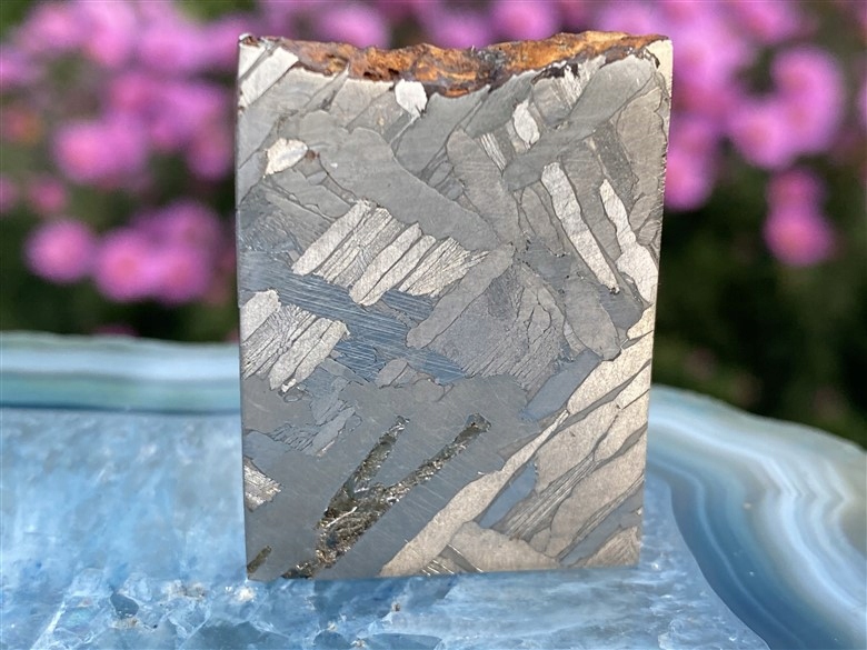 С обеих сторон расположены уникальные видманштеттенские фигуры, характерные для данного типа выгравированных метеоритов, мерцающие в зависимости от угла падения света.