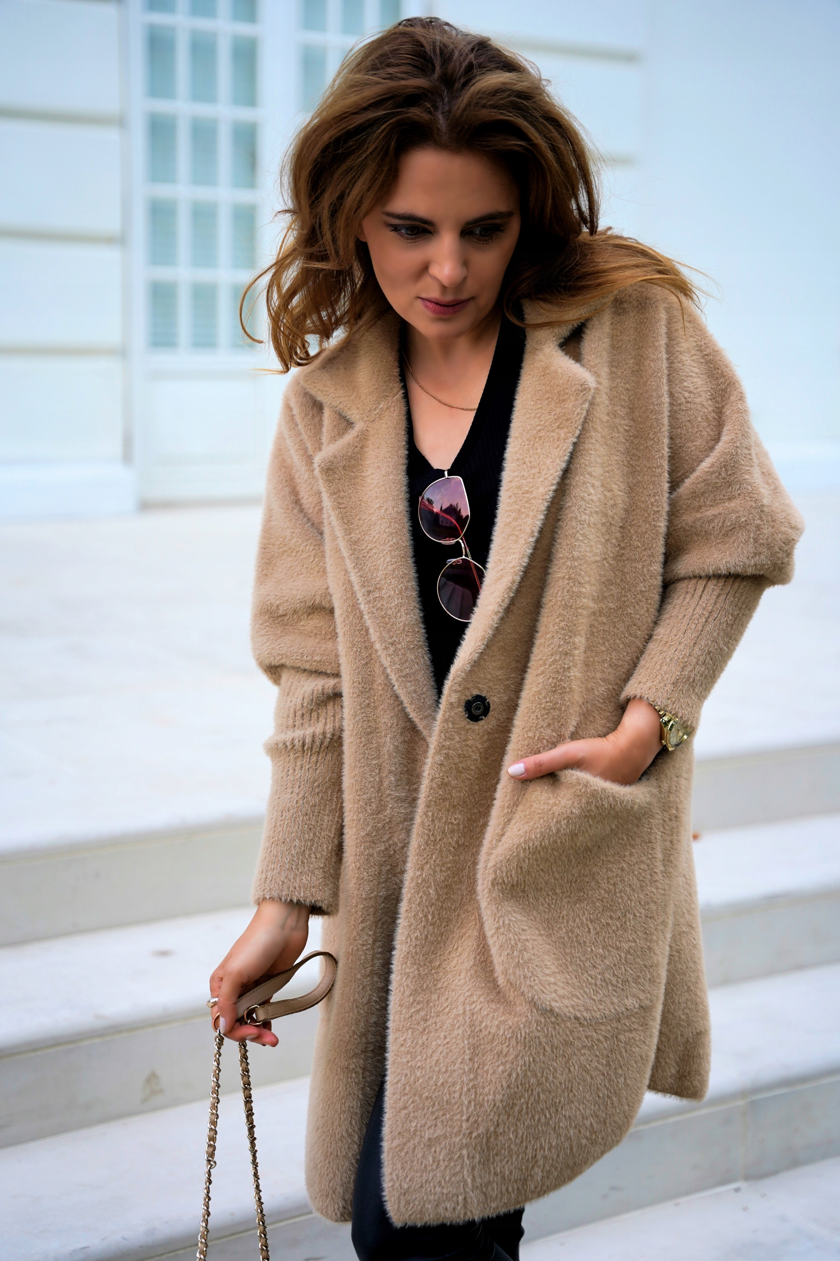 - Пальто из АЛЬПАКИ застегивается на большую кнопку на высоте переплетения;