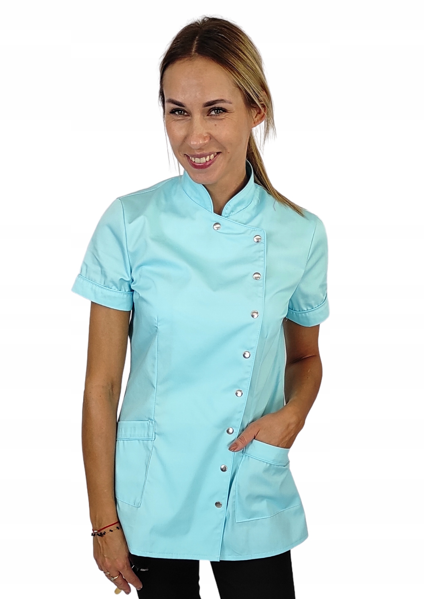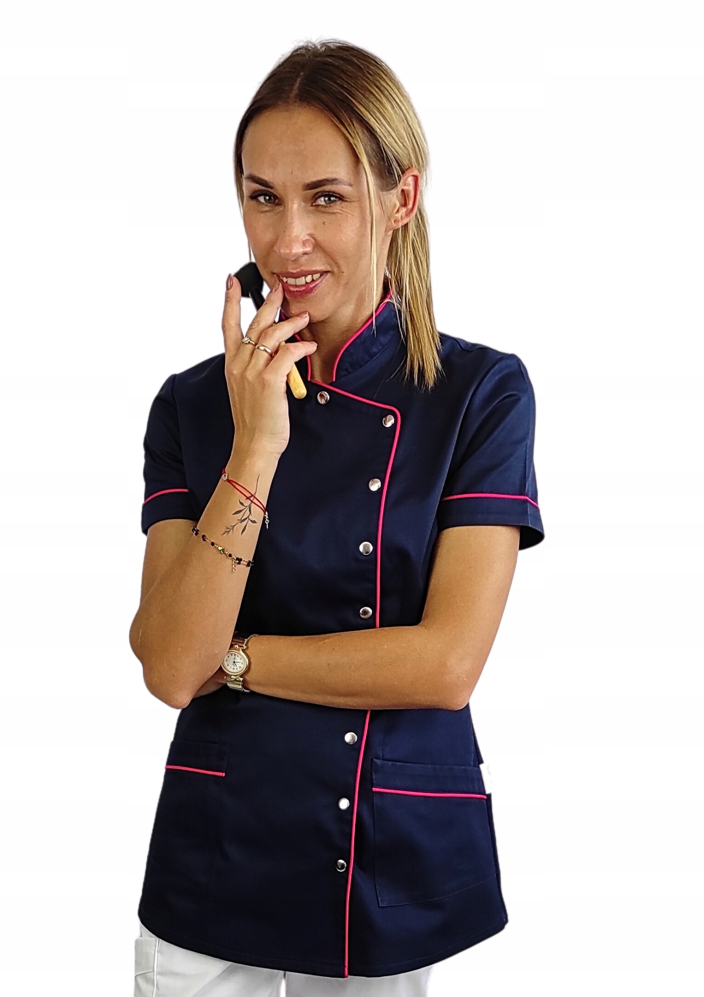 Косметическая туника с воротником стойкой, застегивающимся на удобные и легко застегивающиеся кнопки. Темно-синяя униформа, подчеркнутая золотыми кнопками – что еще больше подчеркивает красивый и приталенный крой, не облегающий фигуру, но в то же время подчеркивающий женственность фигуры. Удобные рукава не стесняют движений во время процедур. Косметологическая туника также имеет два боковых и очень практичных кармана, чрезвычайно полезных в повседневной работе косметолога.