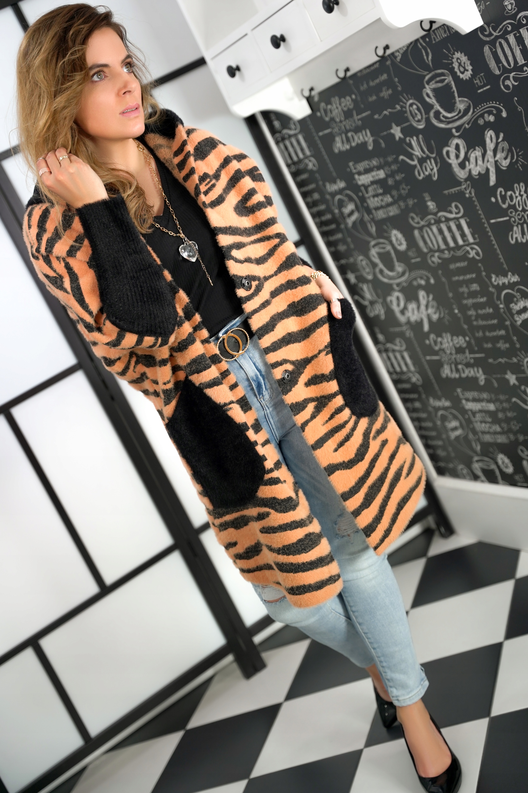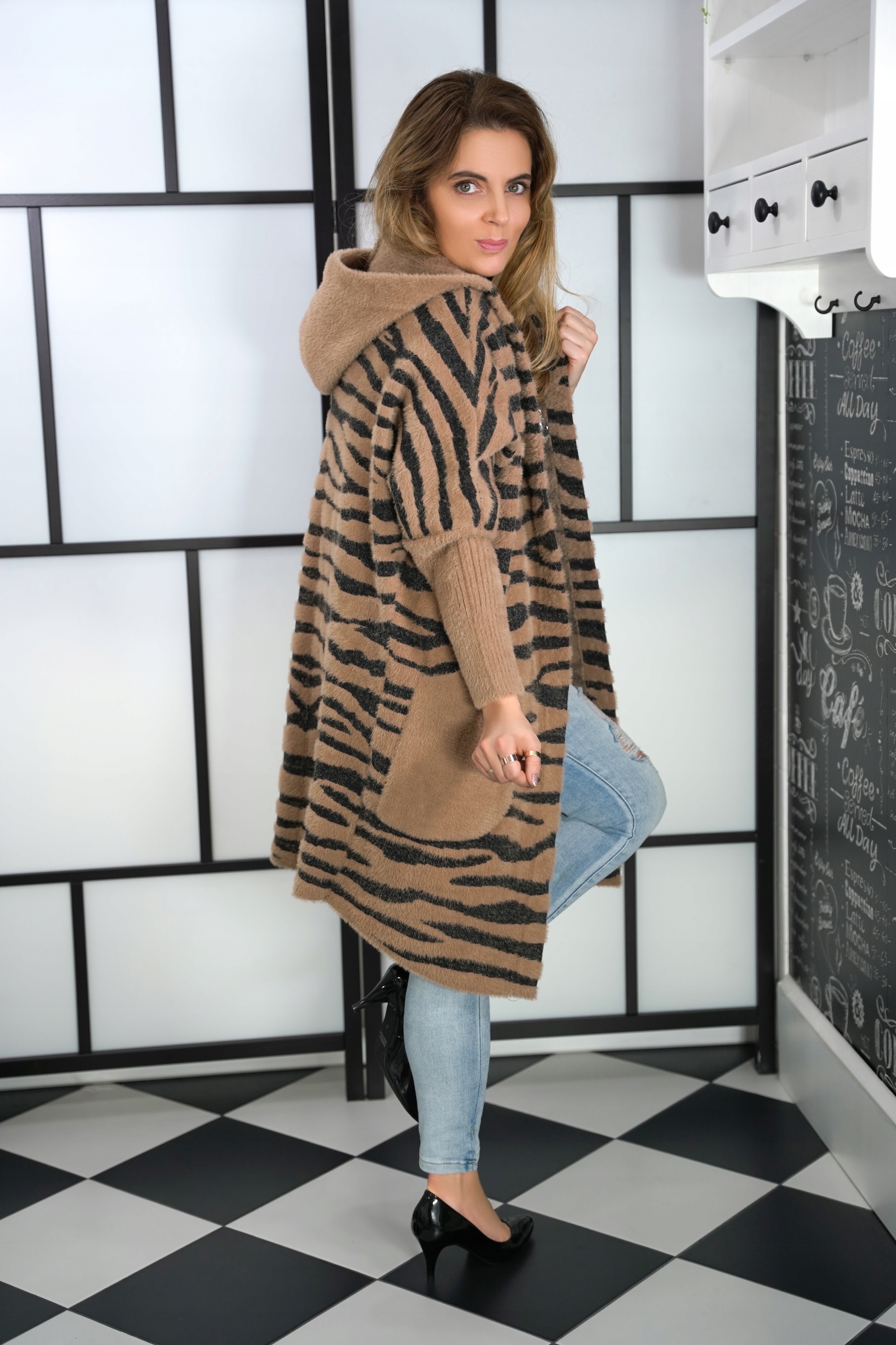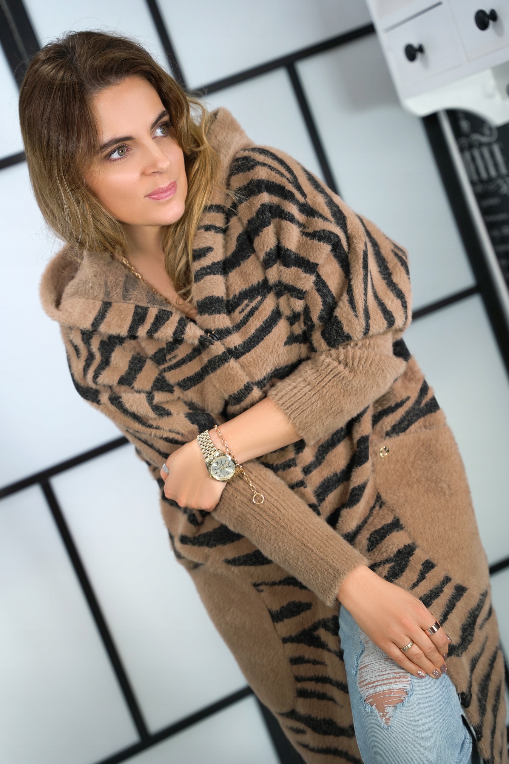 Необычайное ДЛИННОЕ ПАЛЬТО С КАПЮШОНОМ из альпаки с узором ТИГР.