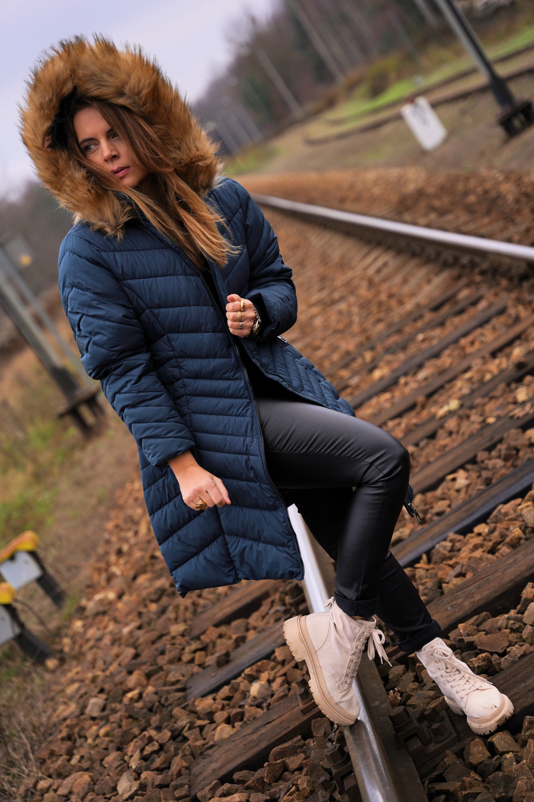 ЧЁРНОЕ СТЕГАНОЕ ЗИМНЕЕ ПАЛЬТО MILF С КАПЮШОНОМ И СЪЕМНЫМ МЕХОМ НА КАПЮШНЕ
