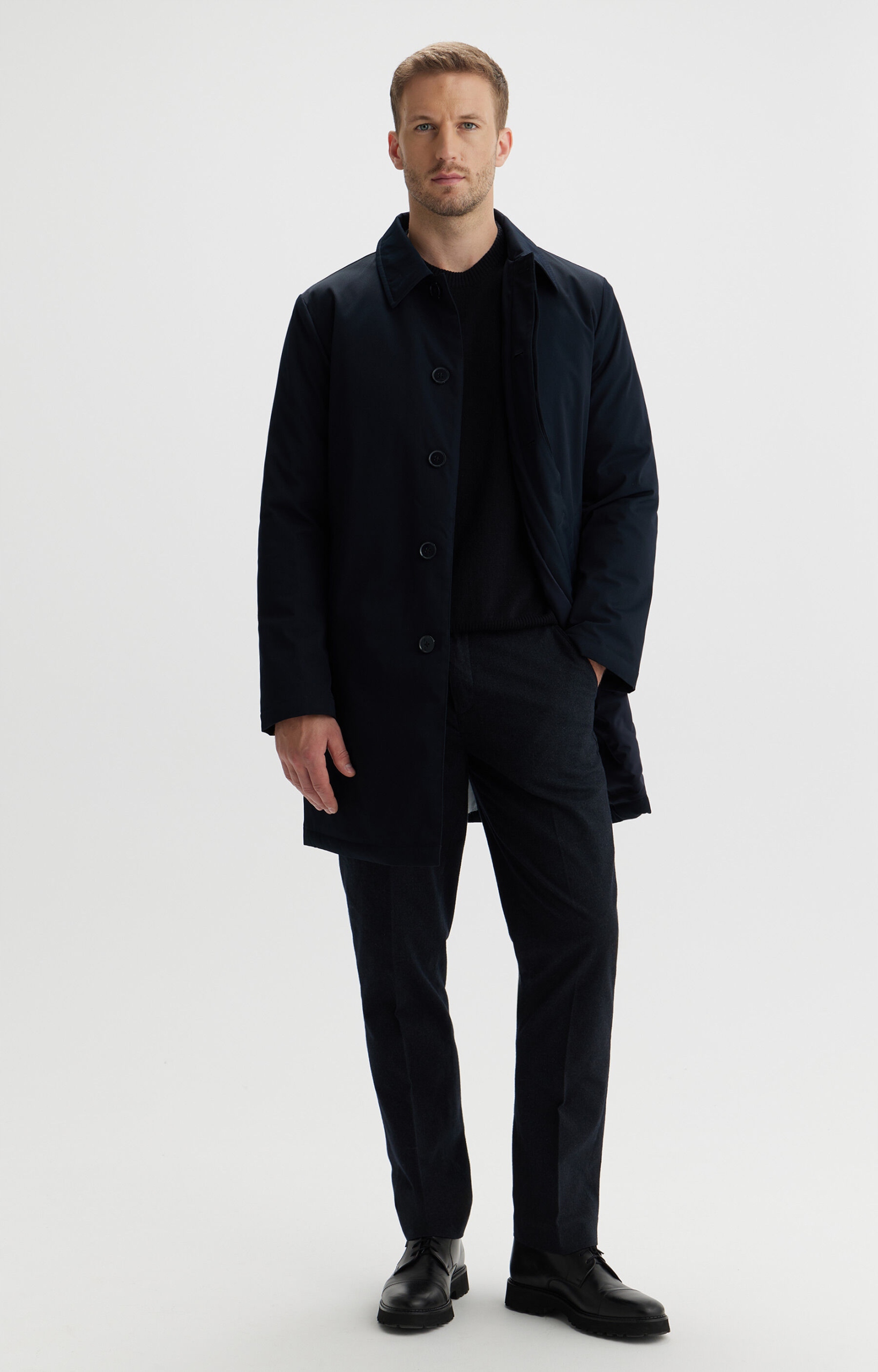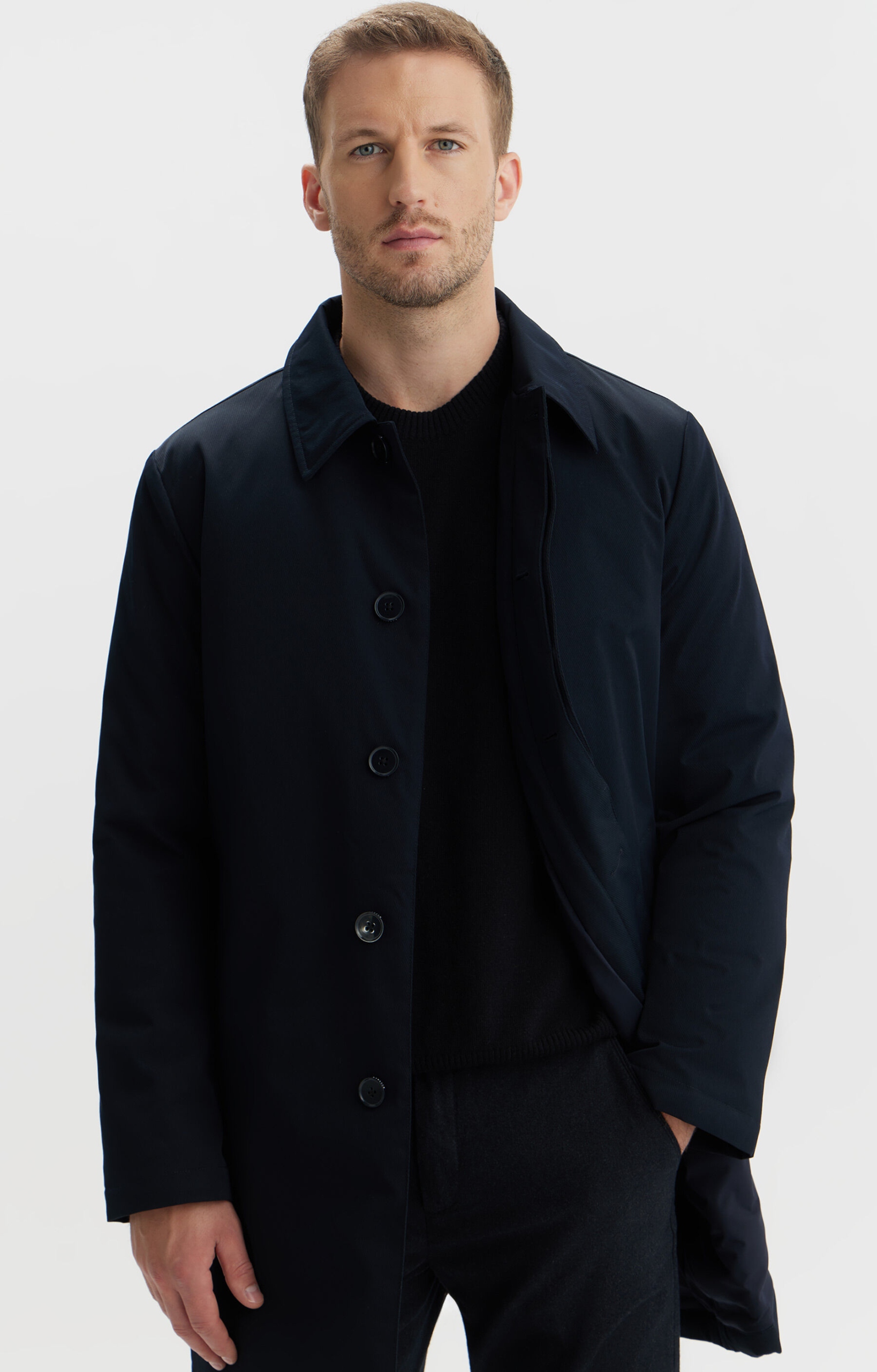 Утепленное мужское пальто темно-синего цвета. Он изготовлен из технической ткани с изящным узором. Застегивается на обтянутые пуговицы. Имеет косые карманы с планками, прямой воротник без воротника-стойки и один разрез сзади. Утеплен натуральным утиным пухом и перьями. Идеально подходит для повседневного городского стиля. Модель на фото имеет рост 188 см, размер 50.