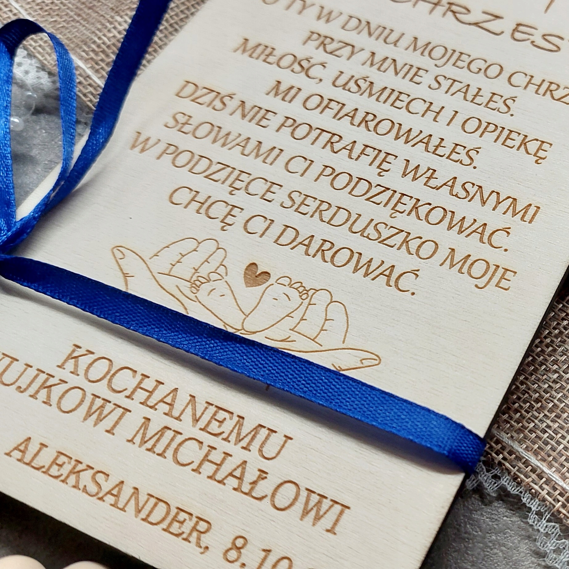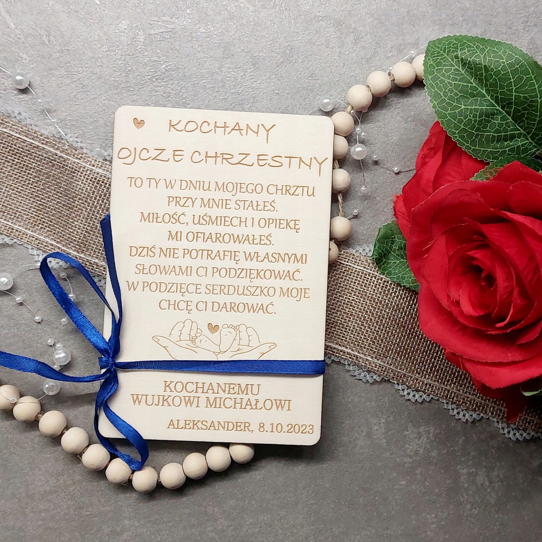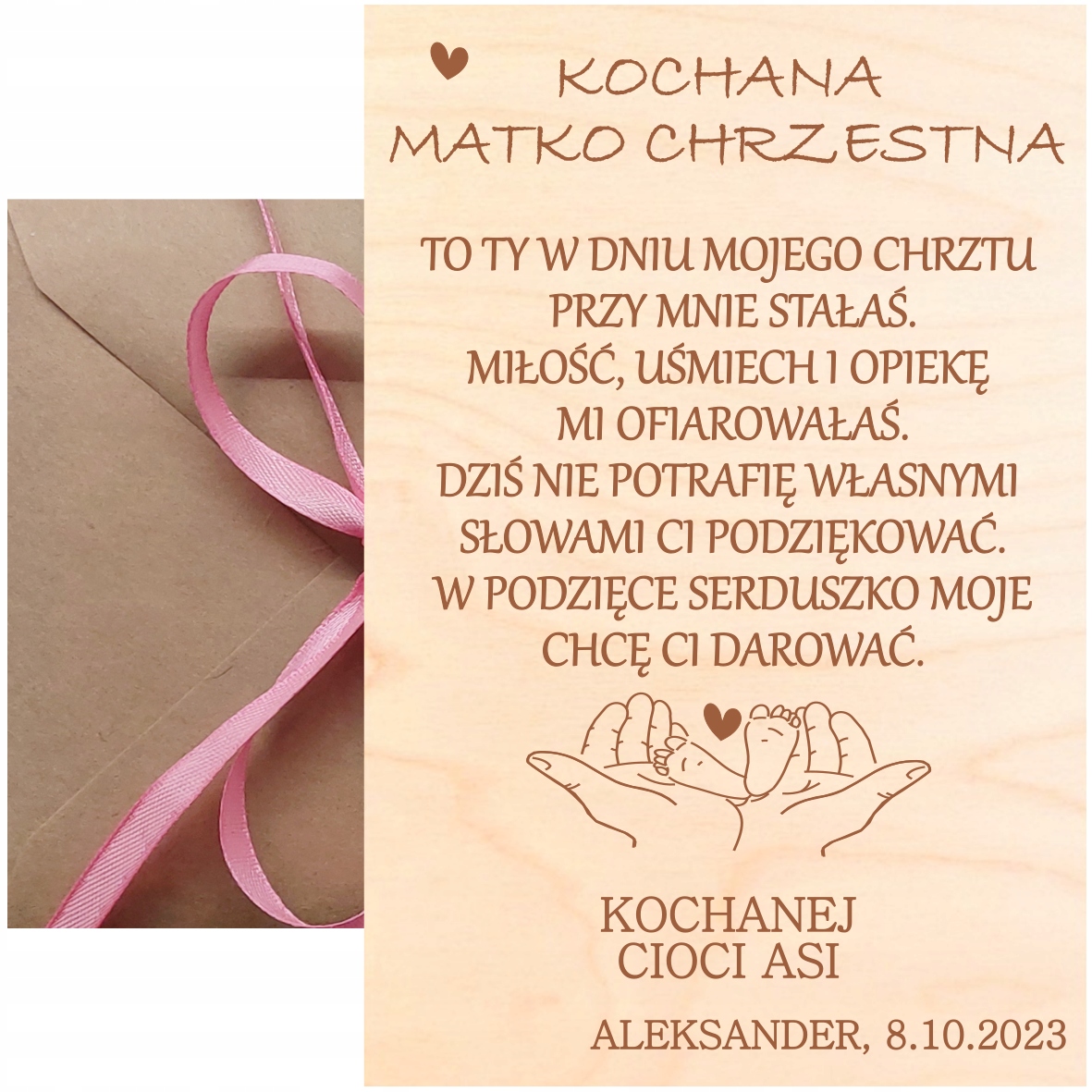 - Деревянная открытка с надписью «ДОРОГОЙ КРЕСТНЫЙ ОТЕЦ» или «ДОРОГАЯ КРЕСТНАЯ МАТЬ» + стихотворение видно на фотографиях + любые имена крестных родителей, ребенка и дата.