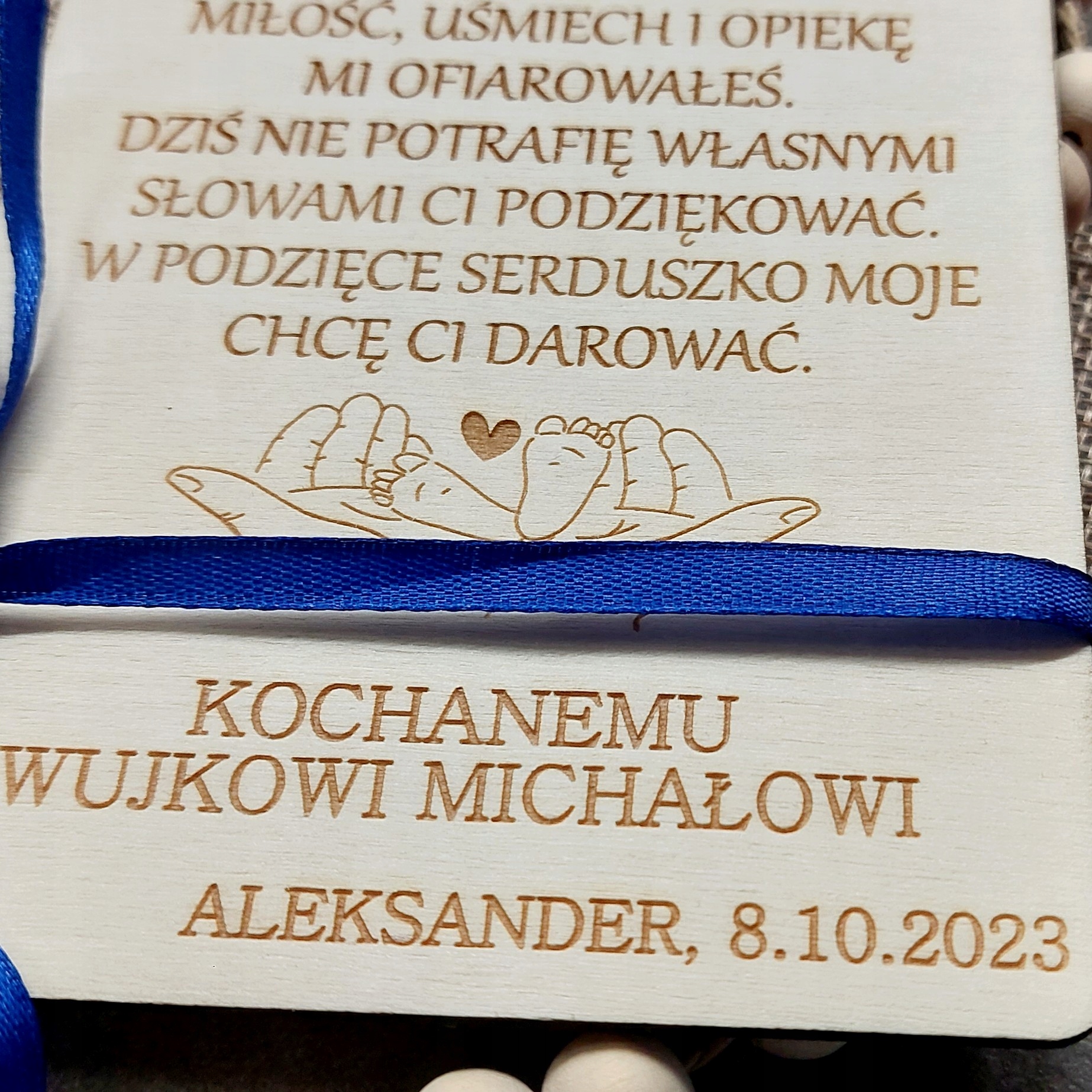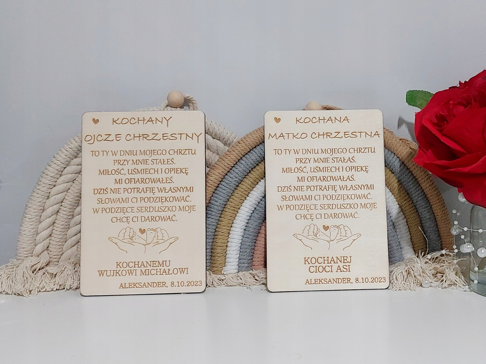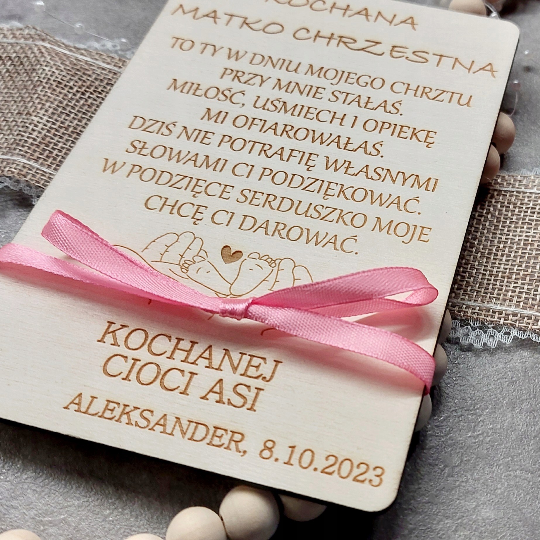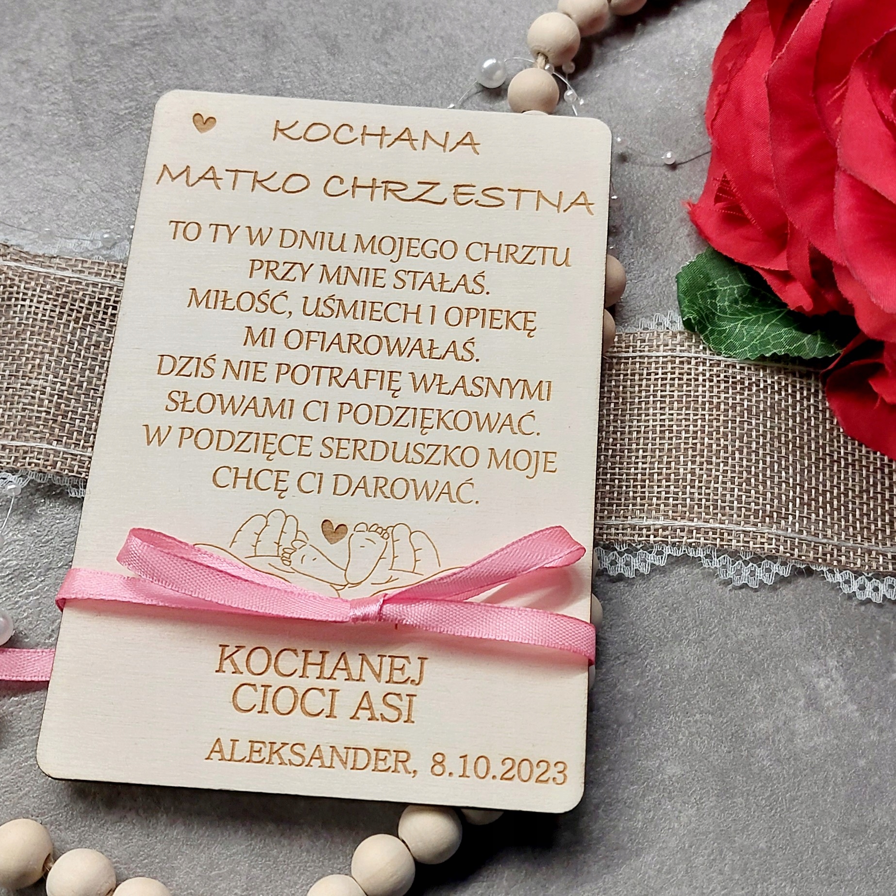 - Деревянная открытка с надписью «ДОРОГОЙ КРЕСТНЫЙ ОТЕЦ» или «ДОРОГАЯ КРЕСТНАЯ МАТЬ» + стихотворение видно на фотографиях + любые имена крестных родителей, ребенка и дата.