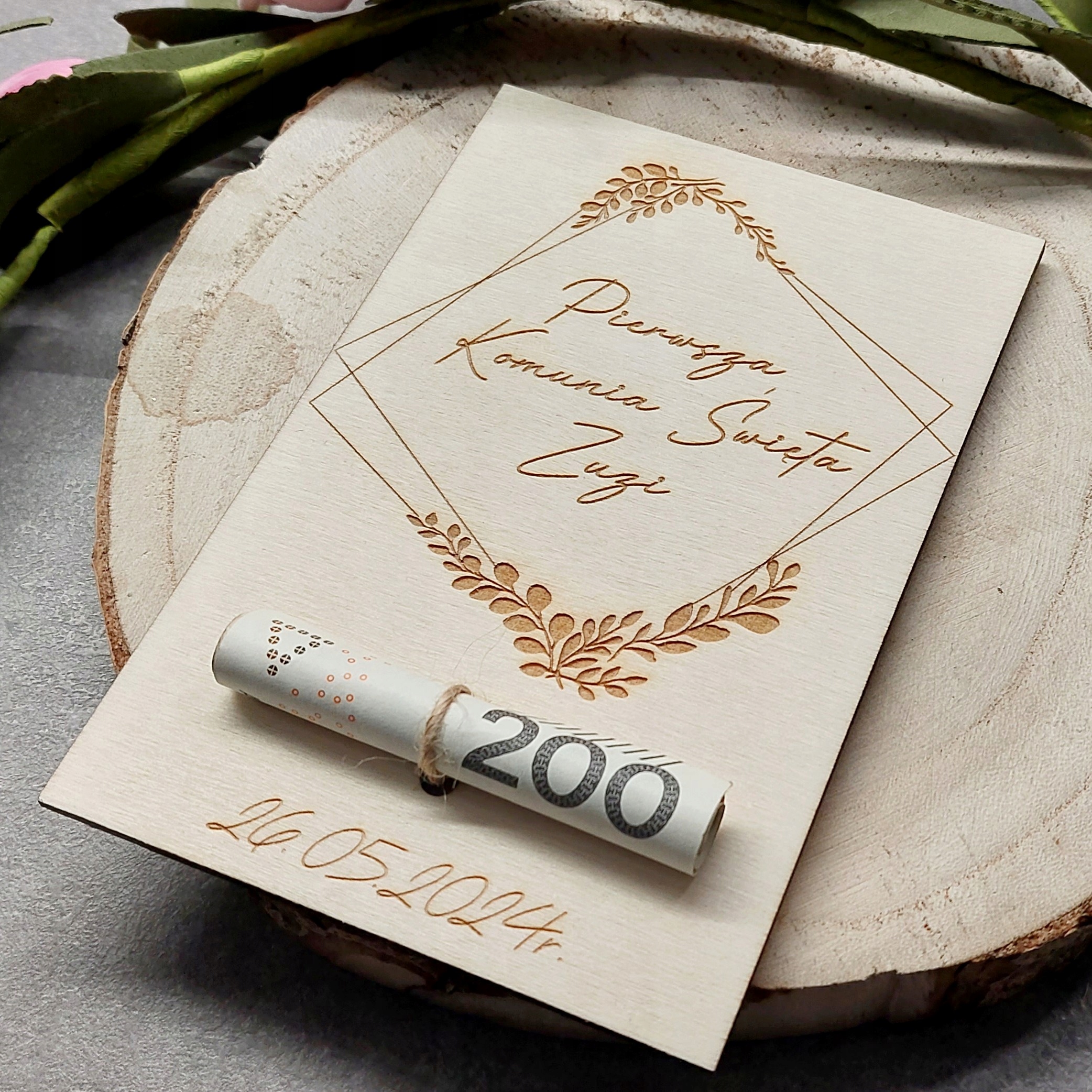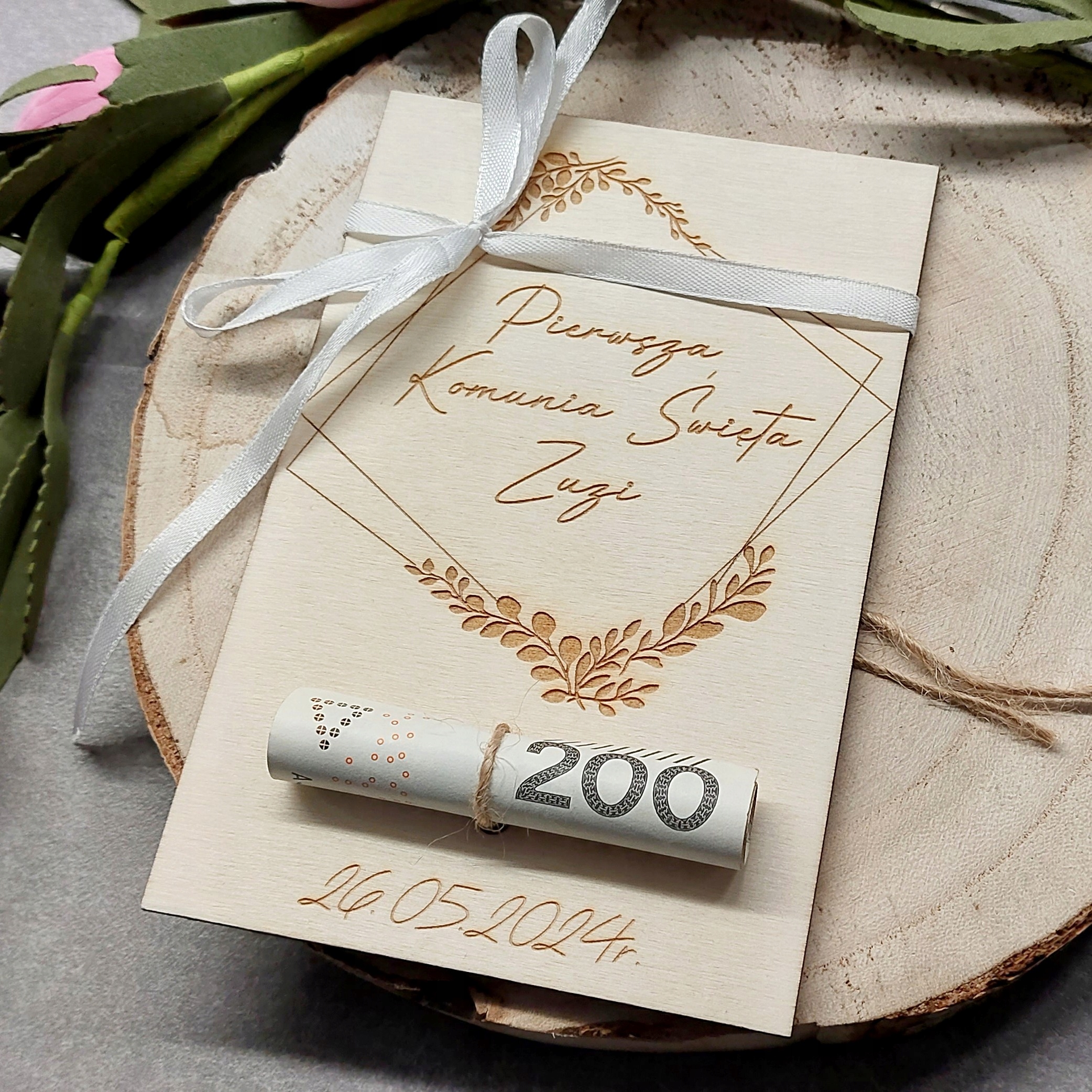 ДЕРЕВЯННАЯ КАРТОЧКА - СУВЕНИРЫ ПЕРВОГО СВЯТОГО ПРИЧАСТИЯ, ПОДАРОК С МЕСТОМ ДЛЯ БАНКНОТЫ (ПЕРСОНАЛИЗАЦИЯ)