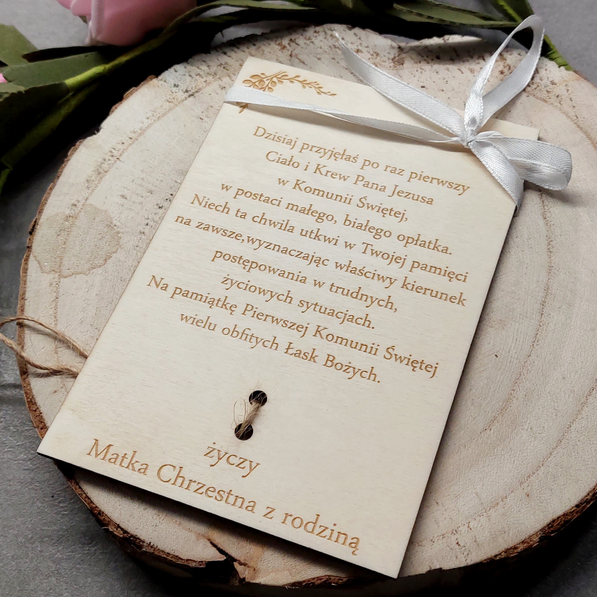 PAMIĄTKA I KOMUNII ŚWIĘTEJ PREZENT NA 1 KOMUNIĘ DREWNIANA KARTKA Z GRAWEREM