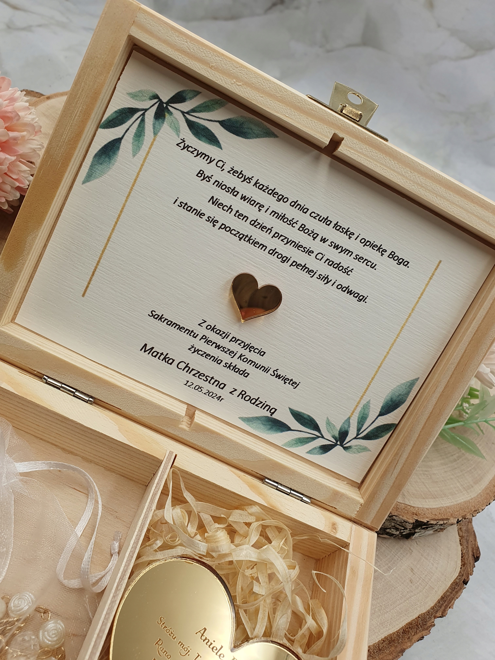 Pamiątka Komunii Świętej-PREZENT, pudełko. Różaniec i serduszko komplet