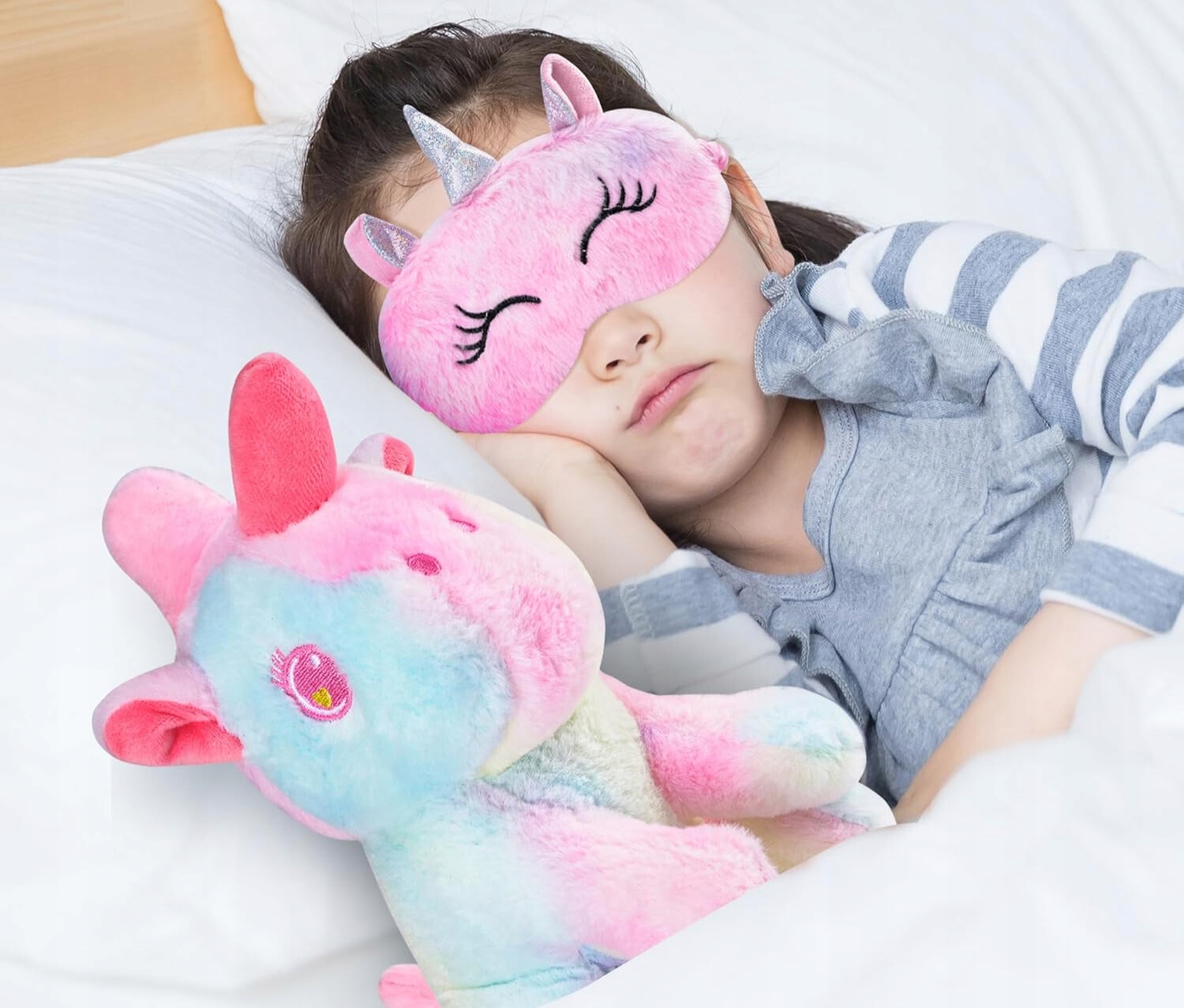 Мягкая маска для глаз с мотивом единорога обеспечит хороший сон, а очаровательный плюшевый талисман станет незаменимым спутником в ночных объятиях. Идеальный набор для мирных и волшебных снов!