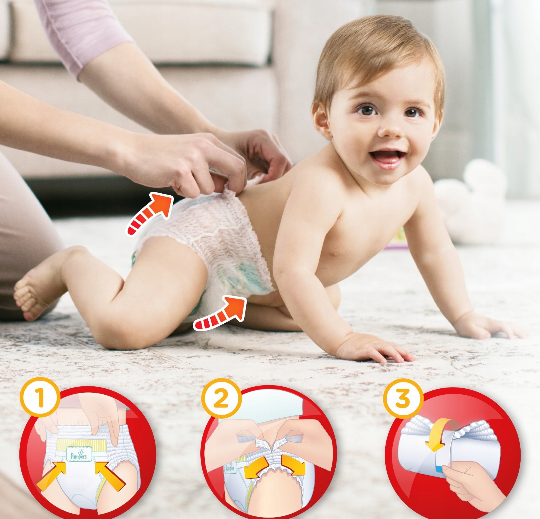 Легкая смена подгузника — новые трусики-подгузники Pampers Pants легко сменить, просто наденьте их, как обычные трусики.