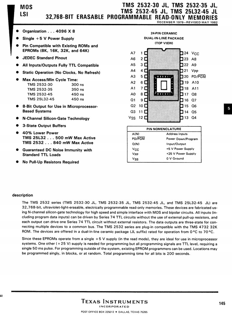 ВИНТАЖНАЯ интегральная схема для инженера-электронщика или коллекционера - память Texas Instruments TMS 2532A-45JL EPROM - (4096 x 8 бит) в корпусе dil24, бывшая в употреблении, должна быть работоспособной.