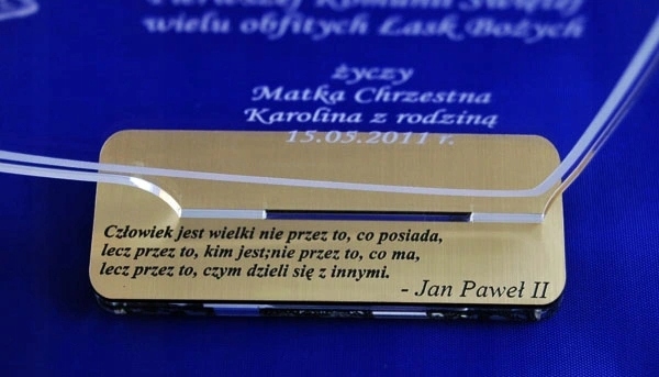 Первое Святое Причастие – один из важнейших обрядов в жизни каждого человека. В этот день крестные родители и приглашенные гости дарят подарки, которые станут напоминанием об этом неповторимом торжестве. Так как же выбрать подарок, который будет уместен по этому случаю? Подарок, преподносимый ребенку в день первого причастия, должен быть таким же особенным, как и повод. Вместо цветов или поздравительной открытки мы предлагаем Вам сувенир к Первому Причастию. Изготовлен из литого акрила высочайшего качества, толщиной 5 мм и размером 19см Х 17,5см.