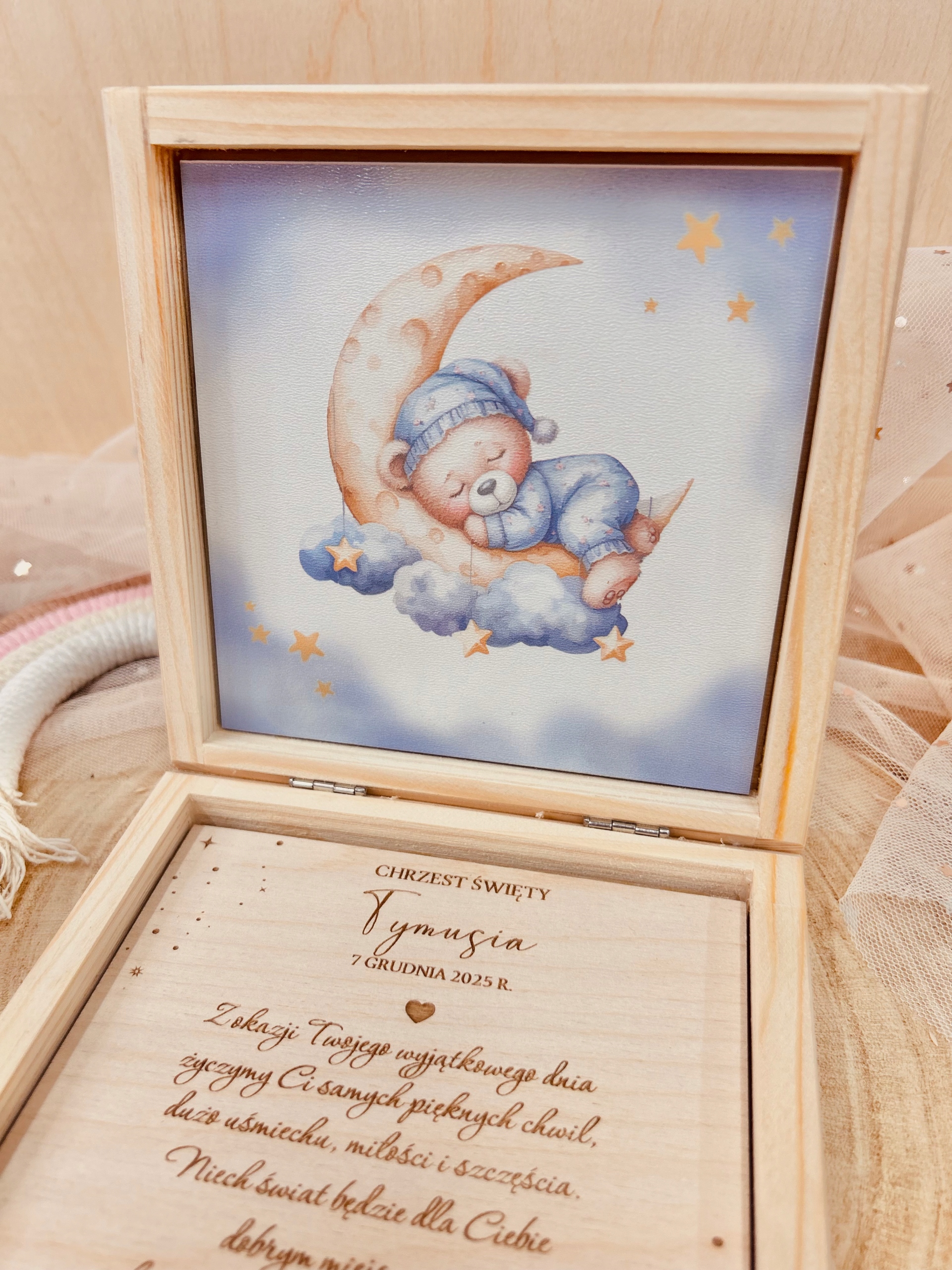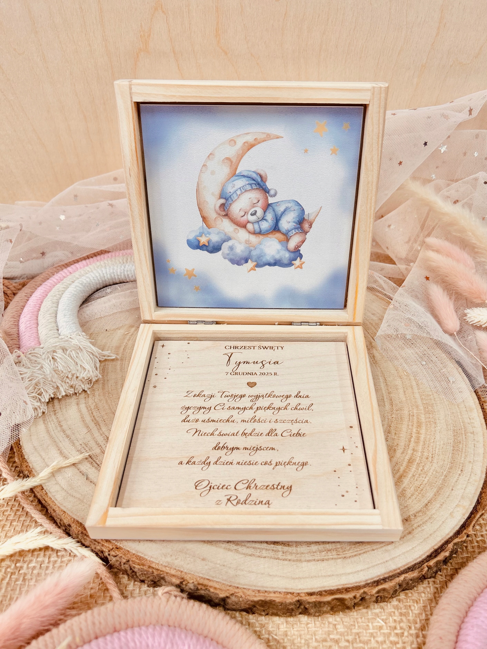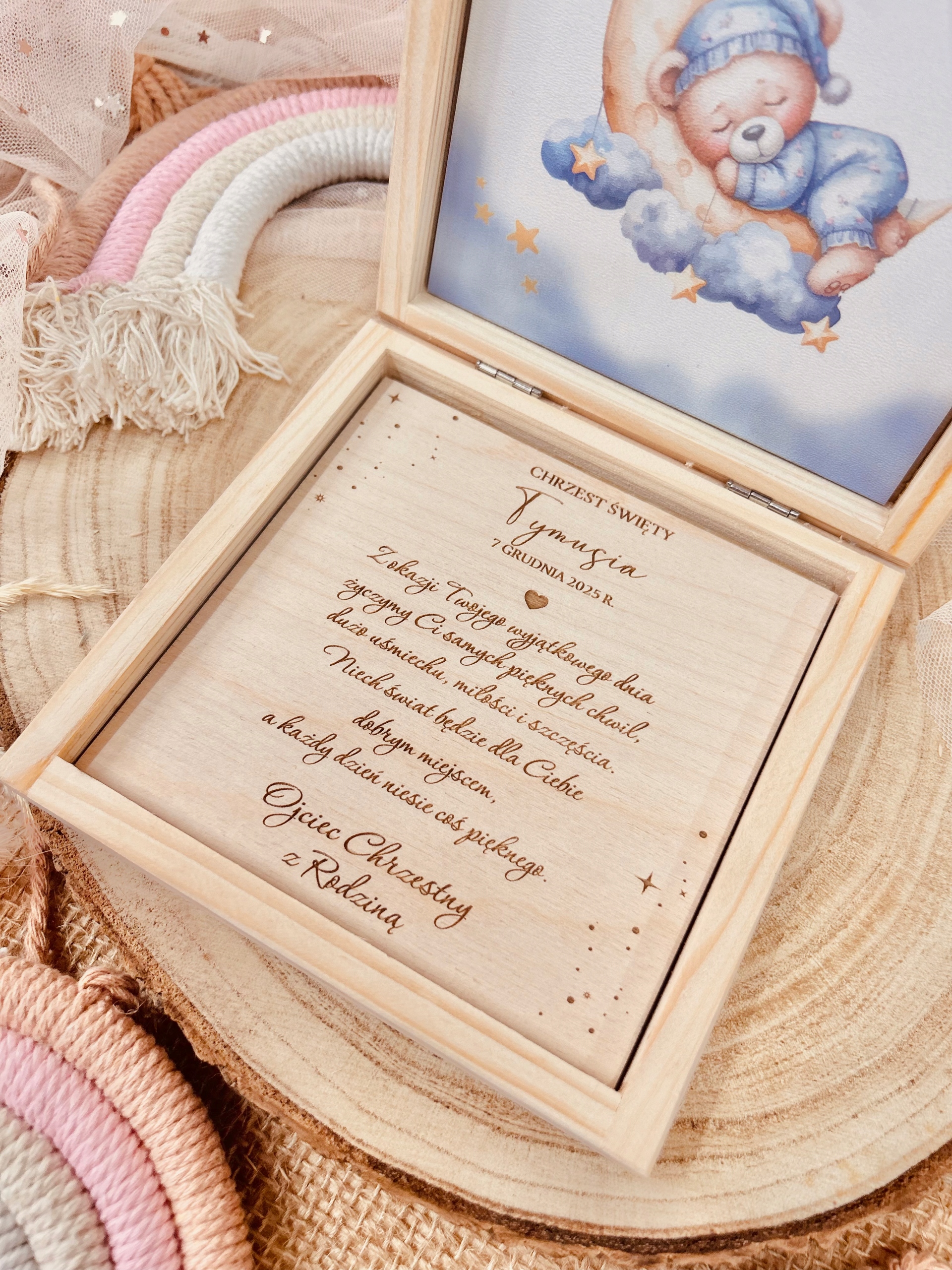 В коробке находятся пожелания и подпись, которую можно персонализировать. В коробку можно положить банкноты и другие небольшие подарки, например. цепь. Имя ребенка выгравировано на внешней стороне коробки.