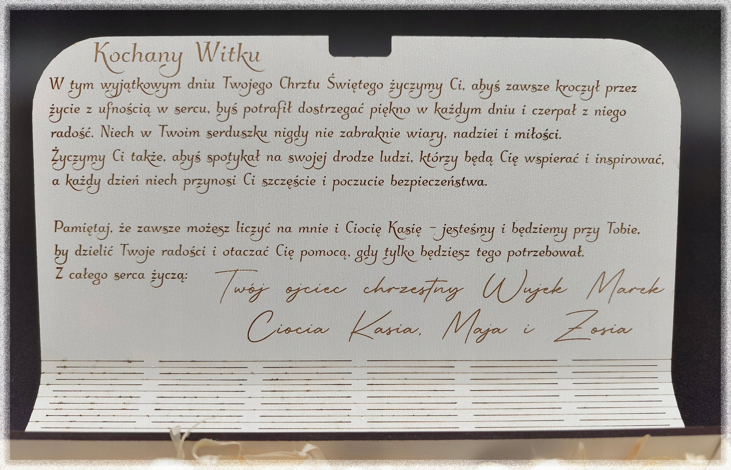 В день вашего крещения мы желаем вам, чтобы вы всегда чувствовали присутствие Бога в своей жизни, что вас будут окружены людьми, которые будут любить и поддерживать вас, и каждый день вызывает у вас улыбку и радость. Пусть ваше сердце будет полным веры, надежды и любви, и ангел -хранитель ведет вас по безопасным дорогам.