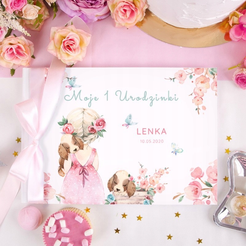 КНИГА ПАМЯТИ для годовалой девочки с собакой С ИМЕНЕМ (+светло-розовая лента)