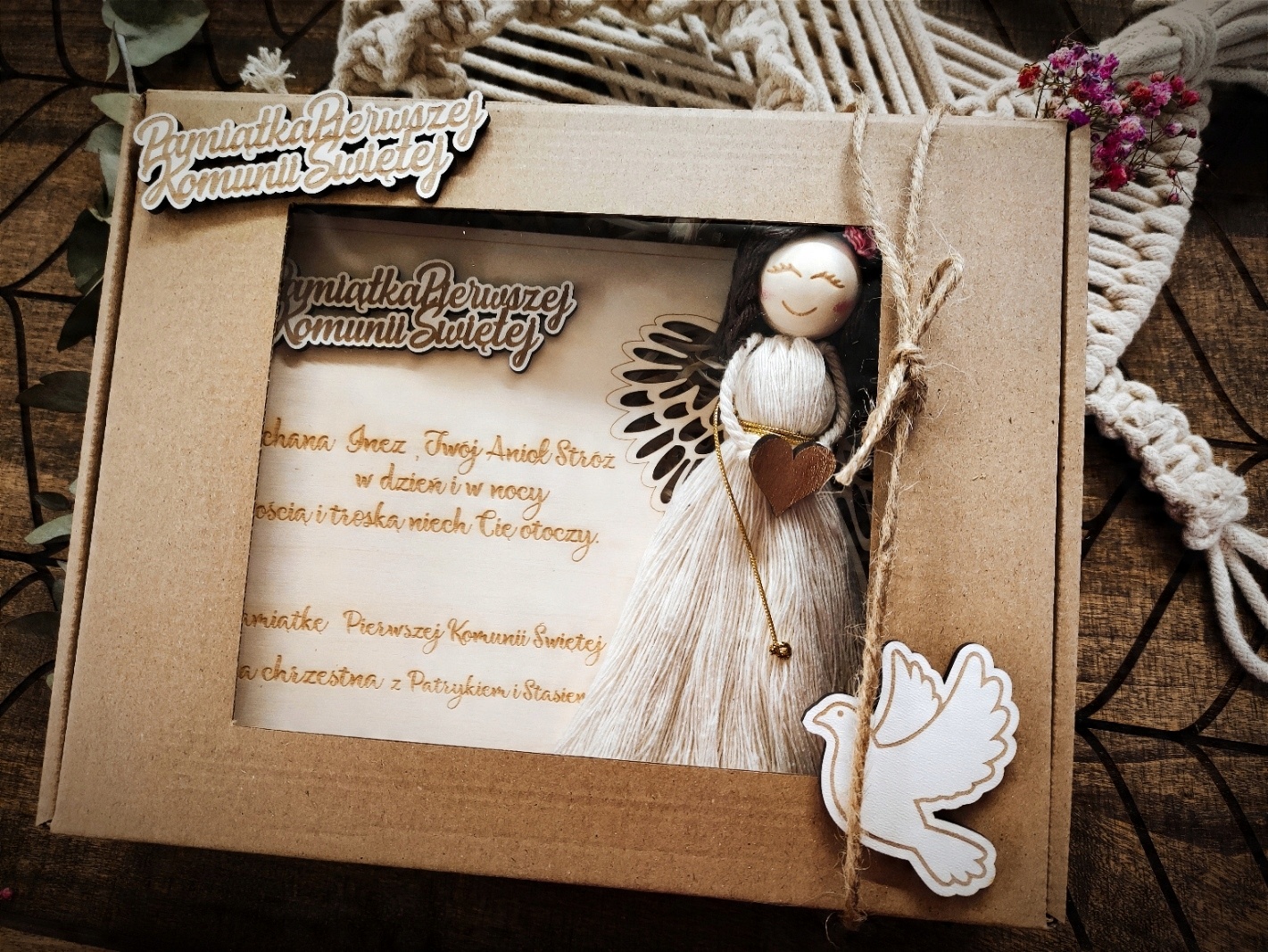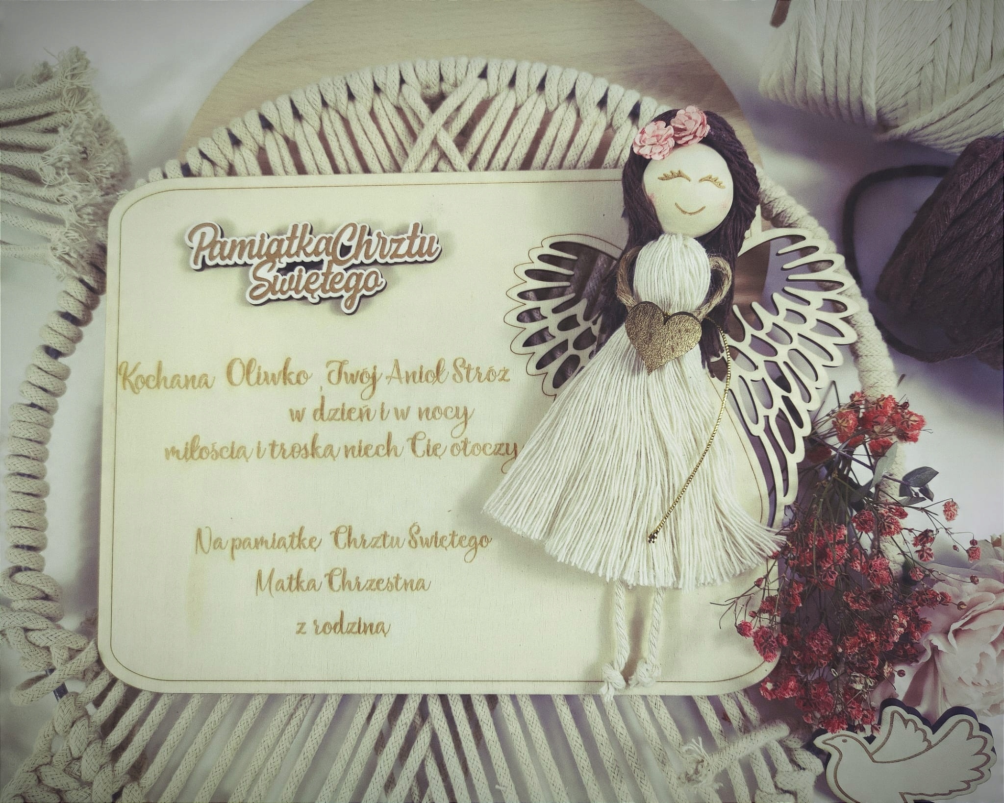 Pamiątka ramka CHRZTU Pierwszej Komunii ANIOŁ STÓŻ makrama personalizowana
