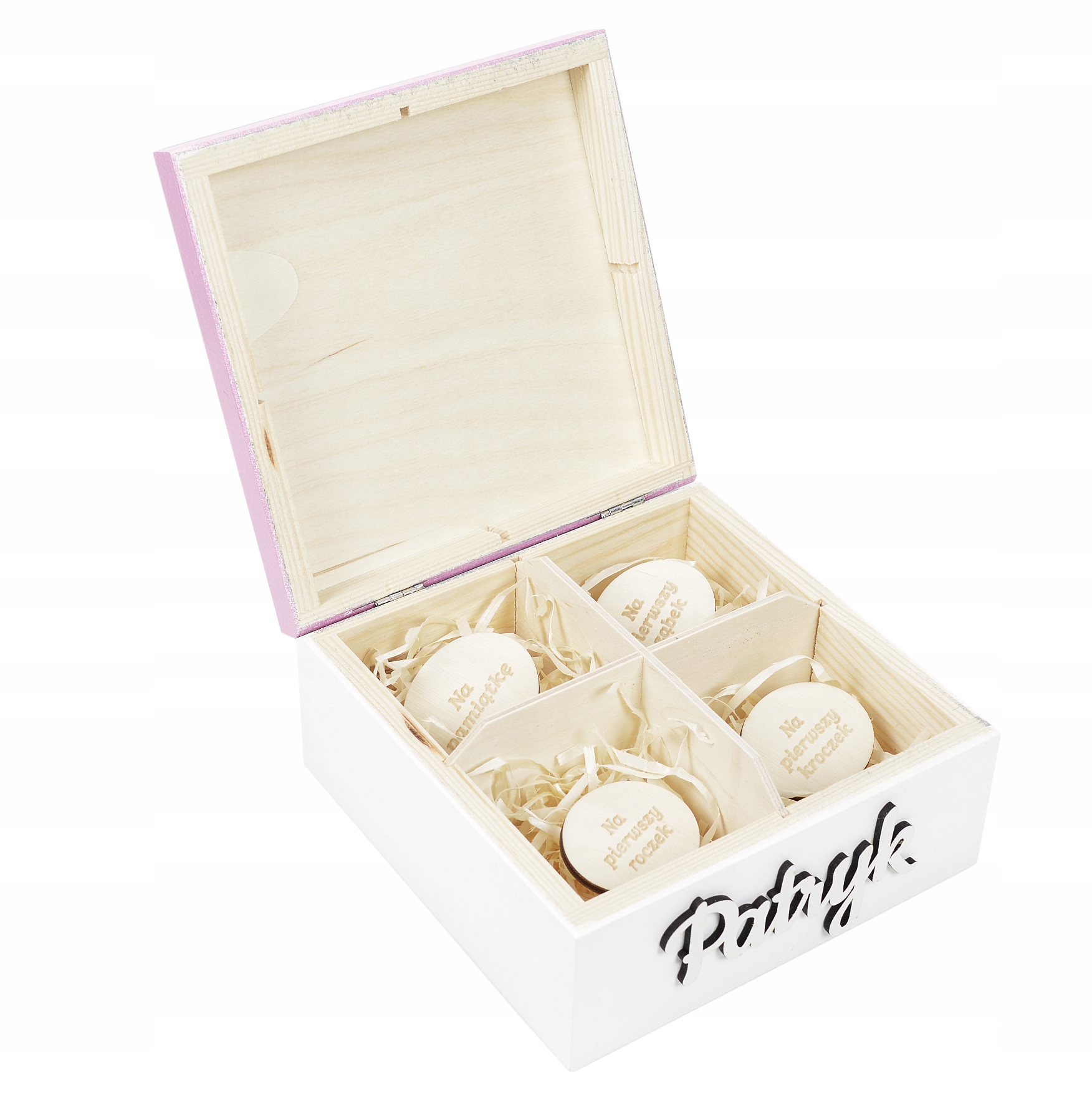 На следующем аукционе мы представляем Вам вневременную и необыкновенно красивую деревянную шкатулку воспоминаний. Это идеальный подарок на рождение ребенка, юбилей, день рождения или на память о крещении. Специальные отделения с гравированными деревянными кольцами помогут выбрать уникальные подарки. Коробка отличается выпуклыми наклеенными элементами с выгравированным свидетельством о рождении, что обязательно порадует родителей малыша.