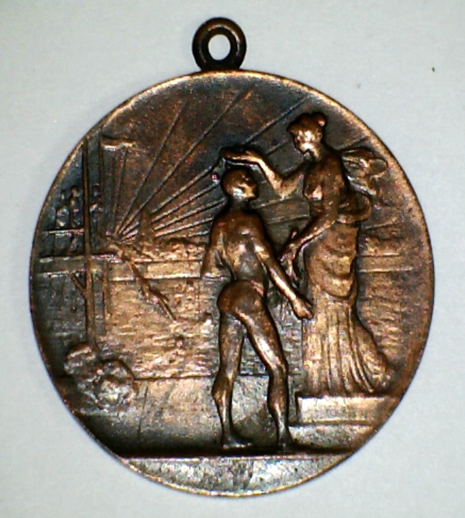 Значок из межвоенного периода, памятные -спортивные. Аверс: Богиня украшает венок игрока. Обратный с надписью V.K.K.Gaujas SV 1000 M 17 VII 38. В верхней части подвески. Диаметр 30 мм, вес 12 грамм.