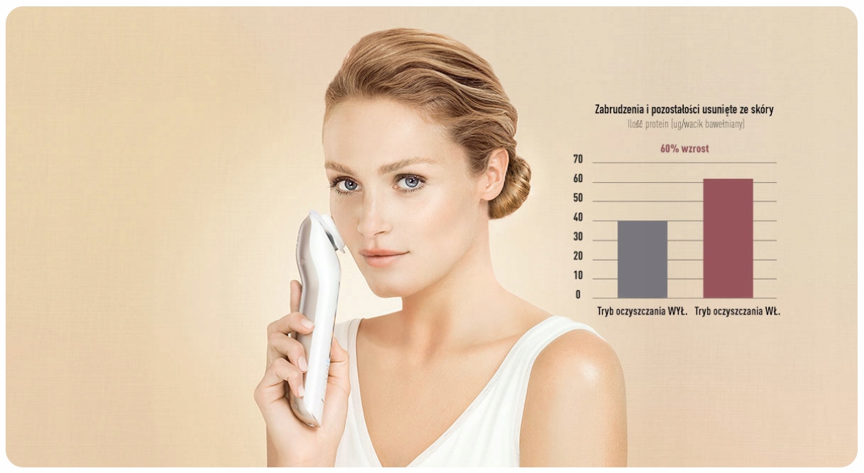 Переменный поток положительных и отрицательных ионов при мягком нагреве (выбираемая температура 37, 40 и 43 градуса Цельсия) легко удаляет до 60 % более глубоко укоренившихся загрязнений и жира с поверхности поры кожи. Эргономичная титановая головка обеспечивает легкий доступ ко всем участкам контура лица.