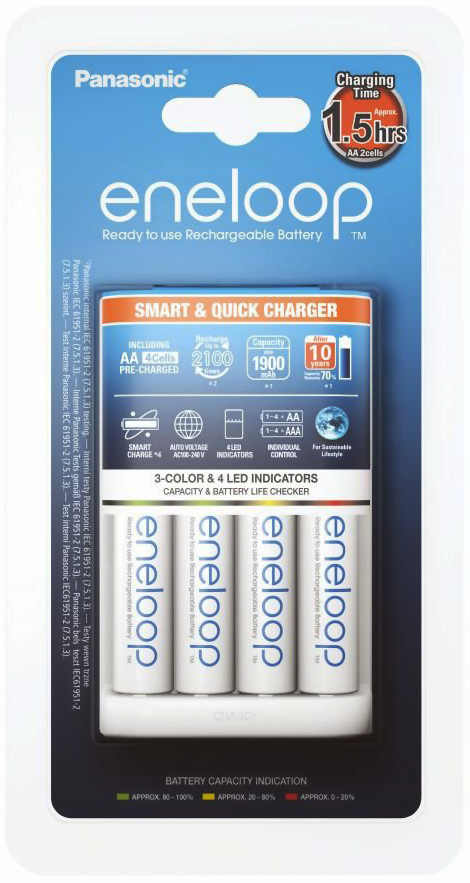 В комплект зарядного устройства входят четыре аккумулятора Eneloop емкостью 1900 мАч.