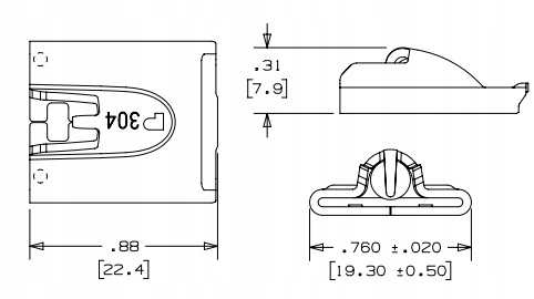 - размер: ширина 19,3 мм (0,76 дюйма), длина 22,4 мм (0,88 дюйма) / высота 7,9 мм (0,31 дюйма)