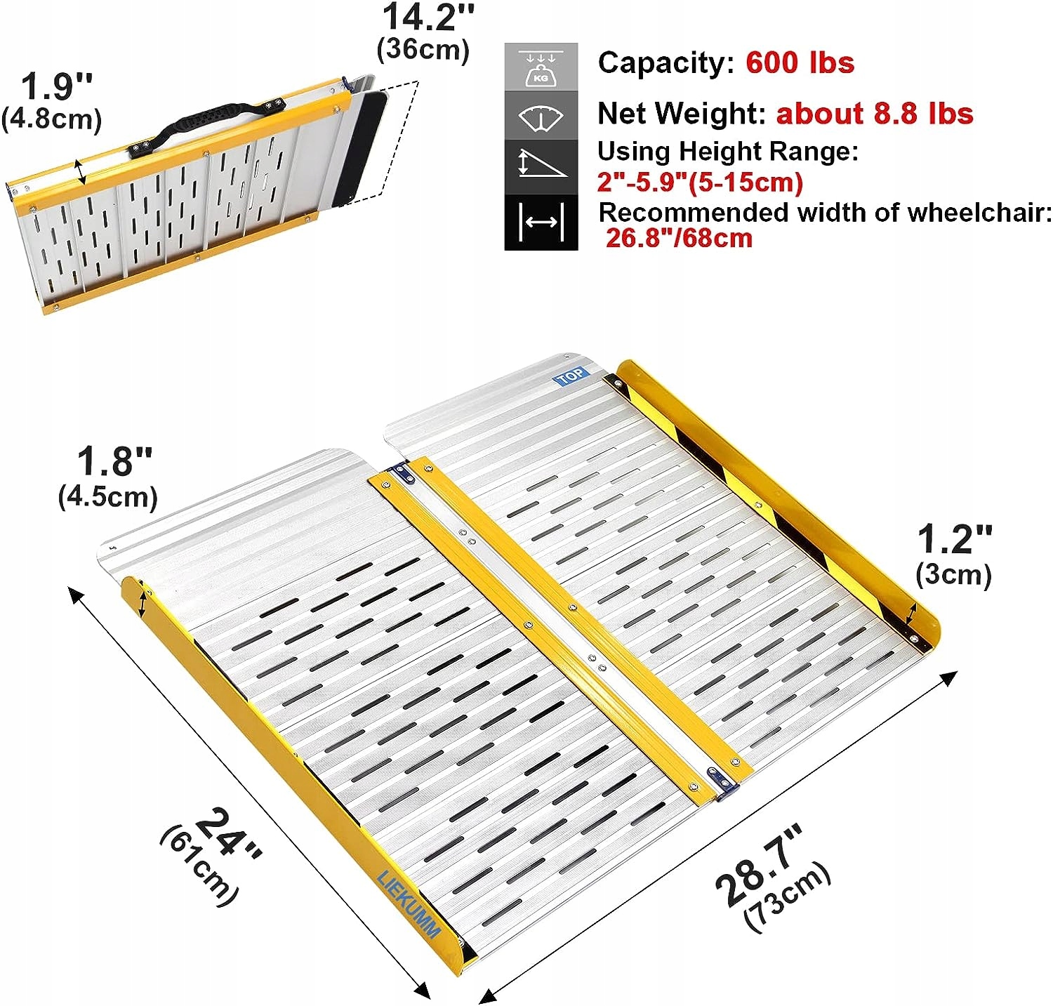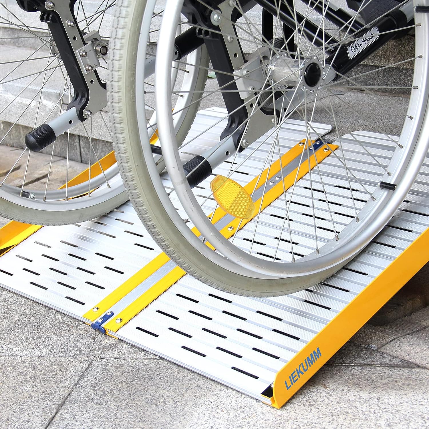 - Широкое использование – складной пандус для инвалидных колясок обеспечивает легкий доступ к ступеням, лестницам и порогам. Идеально подходит для инвалидных колясок и велосипедных пандусов. Примечание. Не подходит для электрических инвалидных колясок и мотоциклов. Алюминиевый сплав отличается очень высокой прочностью, использовать его следует без опасений.