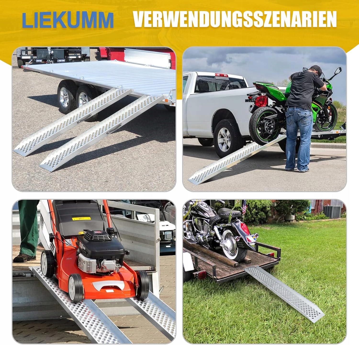 Широкое применение: размеры погрузочной рампы составляют 150 см в длину и 23 см в ширину, одинарная рампа подходит для мотоциклов и мотоциклов для мотокросса, двойные рампы можно использовать на квадроциклах, пикапах, газонокосилках, гольф-карах, снегоочистителях и т. д. другие транспортные средства с 4 колесами.