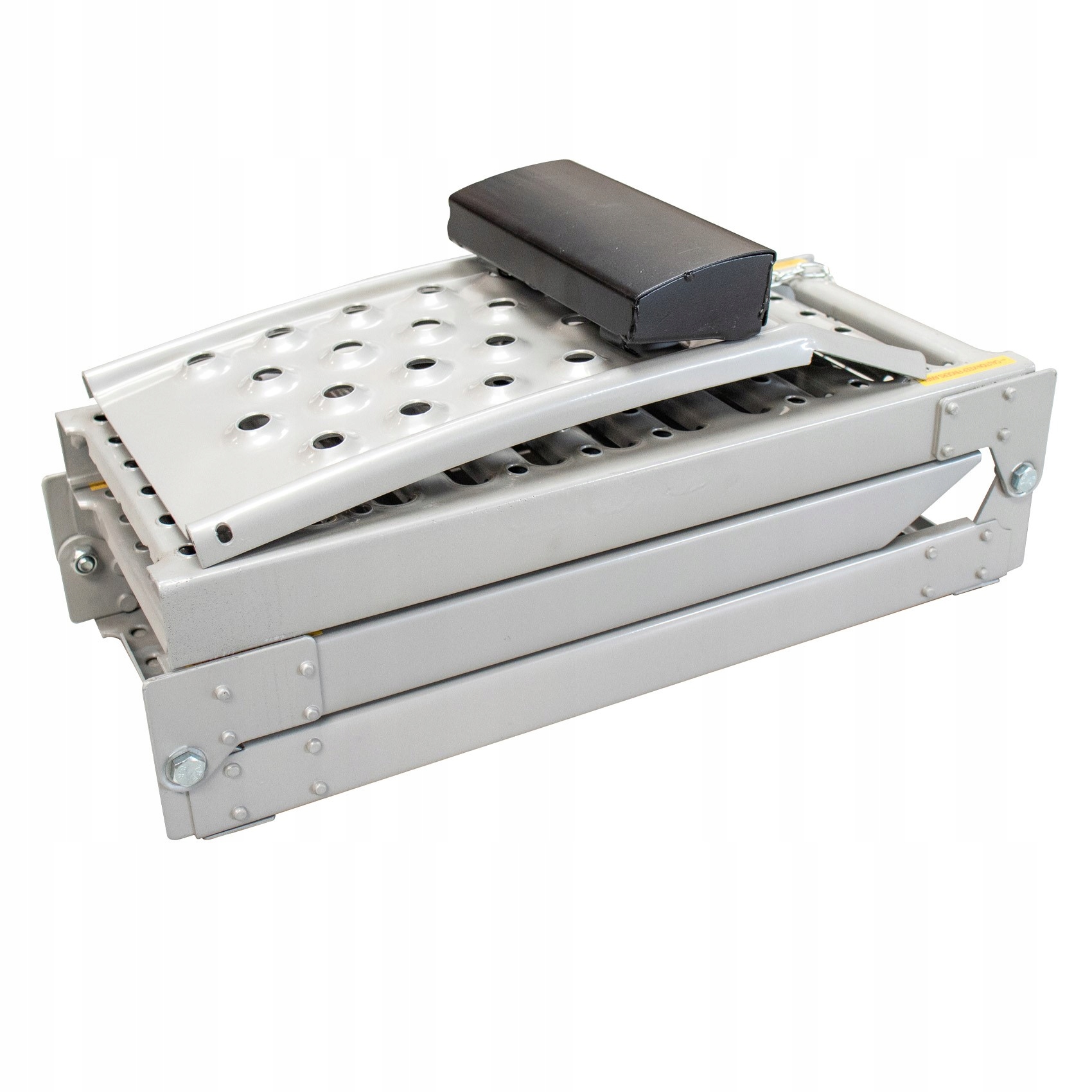- Рельсы изготовлены из высококачественной стали, профилированы для обеспечения прочности. Они могут работать в сложенном положении (режим подставки) и в разложенном положении (режим рампы). Каждая деталь имеет дополнительный клин, предотвращающий ее случайное наезд на подставку.