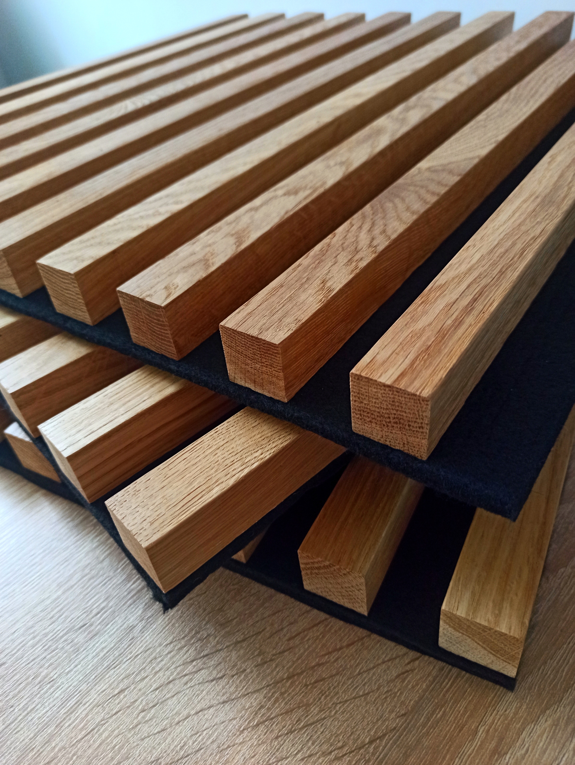 Акустическая панель поглощает звуковые волны, устраняя эффект эха в помещении. комнате и выглядит чрезвычайно эстетично. Фетр, из которого изготовлена основа для ламелей, покрыт тефлоном, поэтому на нем не оседает пыль и его легко чистить
