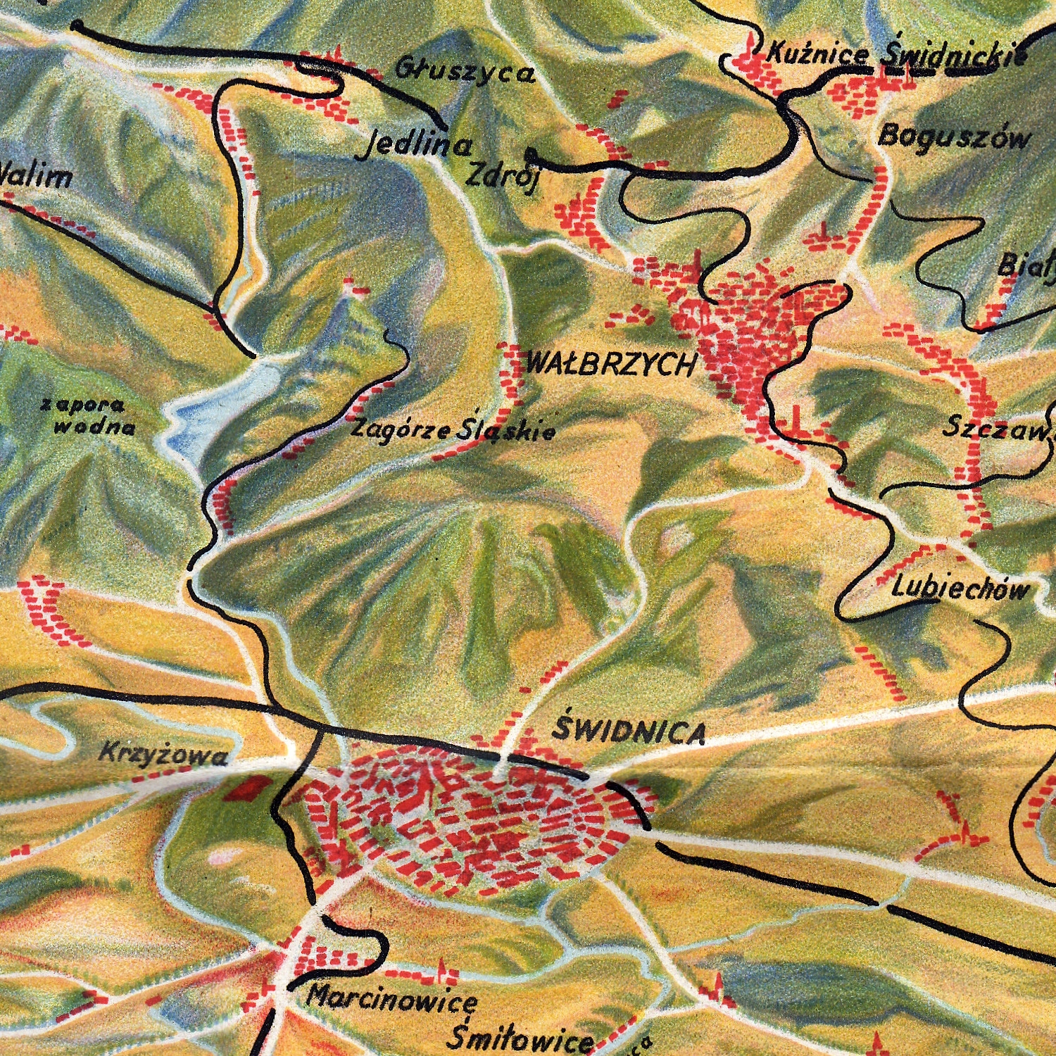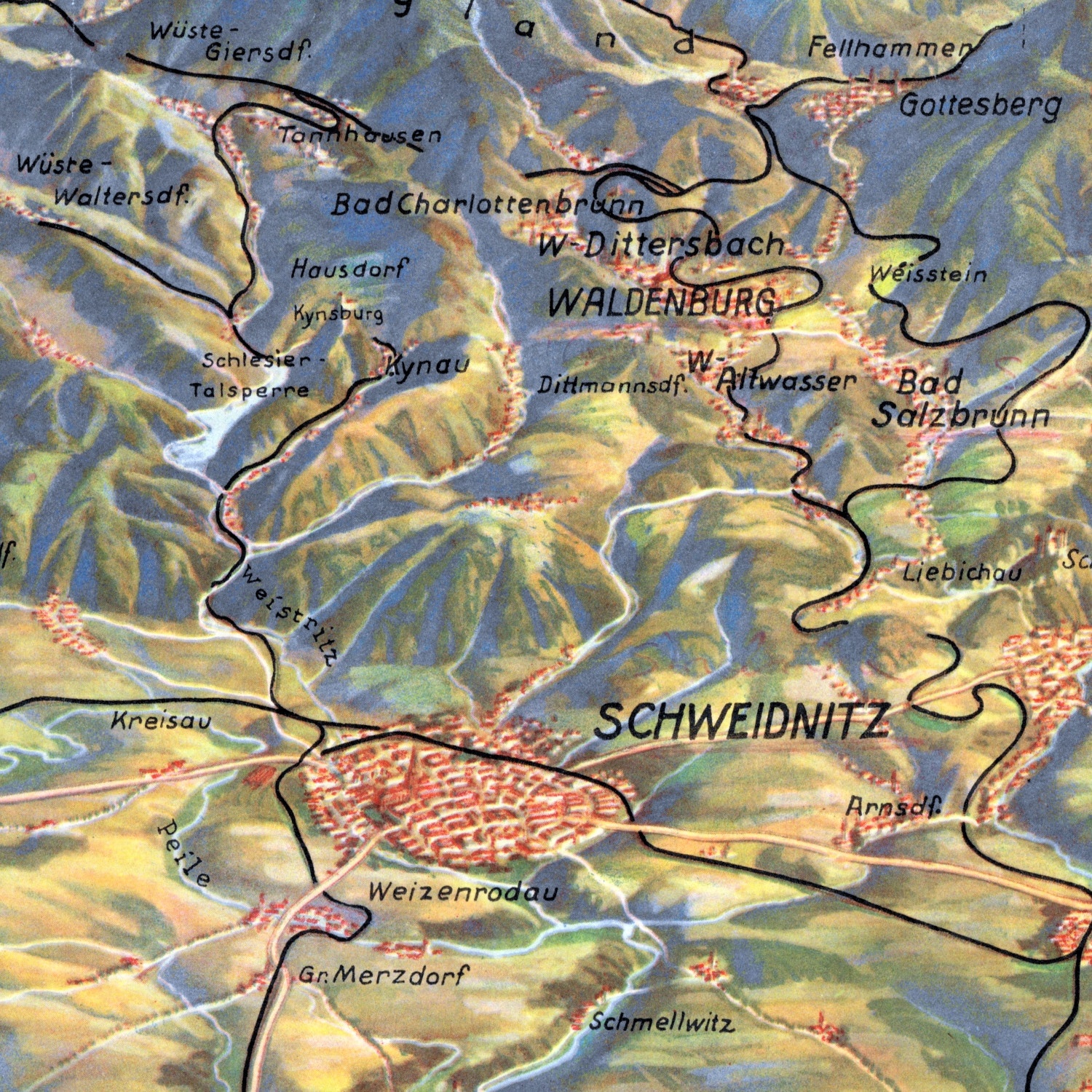 Взгляд с вида птичьего глаза от Вроцлава на юг - отсюда и название «Панорама Судетов с севера». На переднем плане Góra ślęa (Sobótka), затем Sudeten Przedgórze и различные судетены. Из -за его ярких цветов и умело посвященной местности карта производит впечатление трехмерного. Даже самые маленькие города, основные и второстепенные дороги и железнодорожные линии явно видны