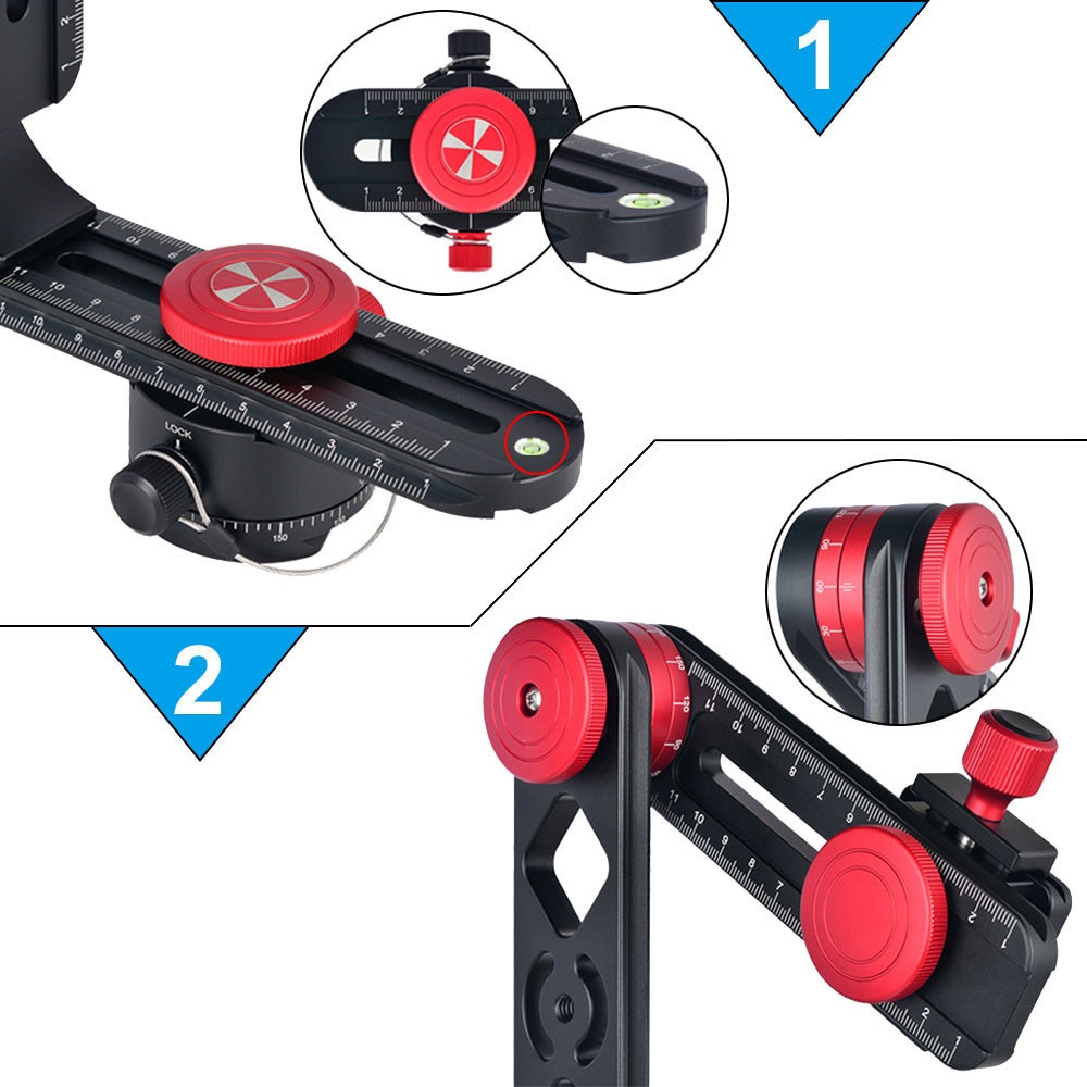 - 360 ° Панорама Движение с калиброванной точностью, легко записывать перекрывающиеся фотографии в горизонтальной панораме. Основой кадрирования является лазерная выгравирована с указателями индекса от 0 ° до 360 °.