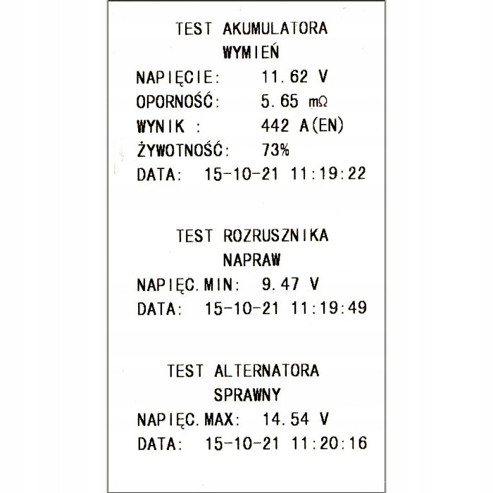ТЕСТ СТАРТЕРА дает результат как значение наименьшего полученного напряжения батареи. во время запуска и выдает одно из сообщений: