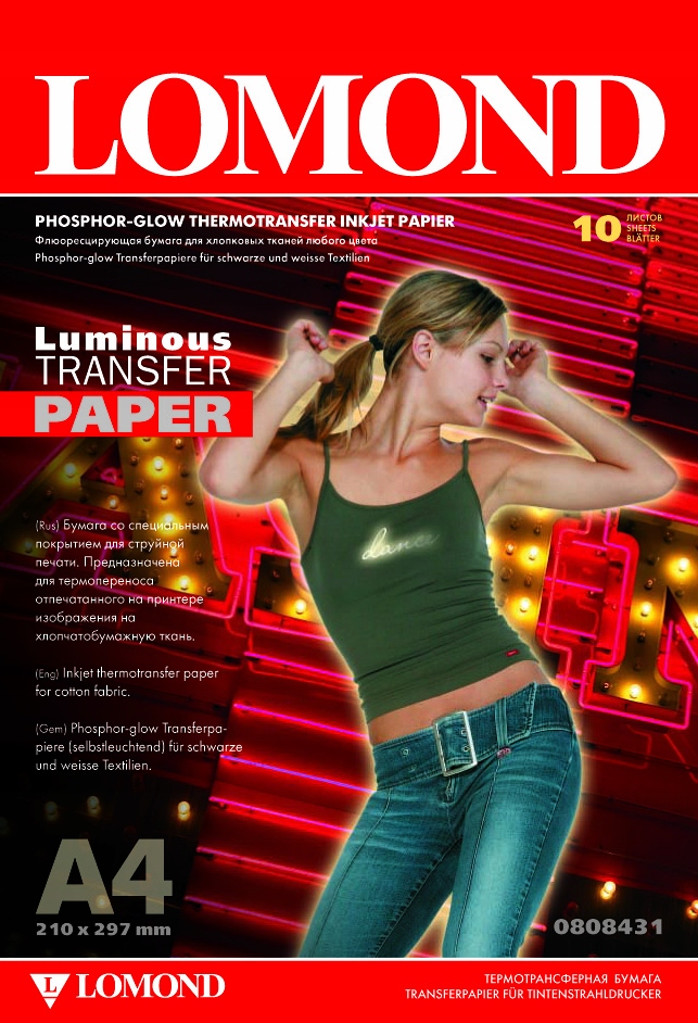 Термотрансферная бумага Lomond 0808431 предназначена для хлопчатобумажных тканей всех цветов. Нужное изображение распечатывается на струйном принтере (лазерный принтер использовать нельзя), с максимальным качеством 2880 dpi, а затем распечатанное изображение переносится на рубашки (футболки) или просто на ткань с помощью термотрансферного пресса. или утюгом.