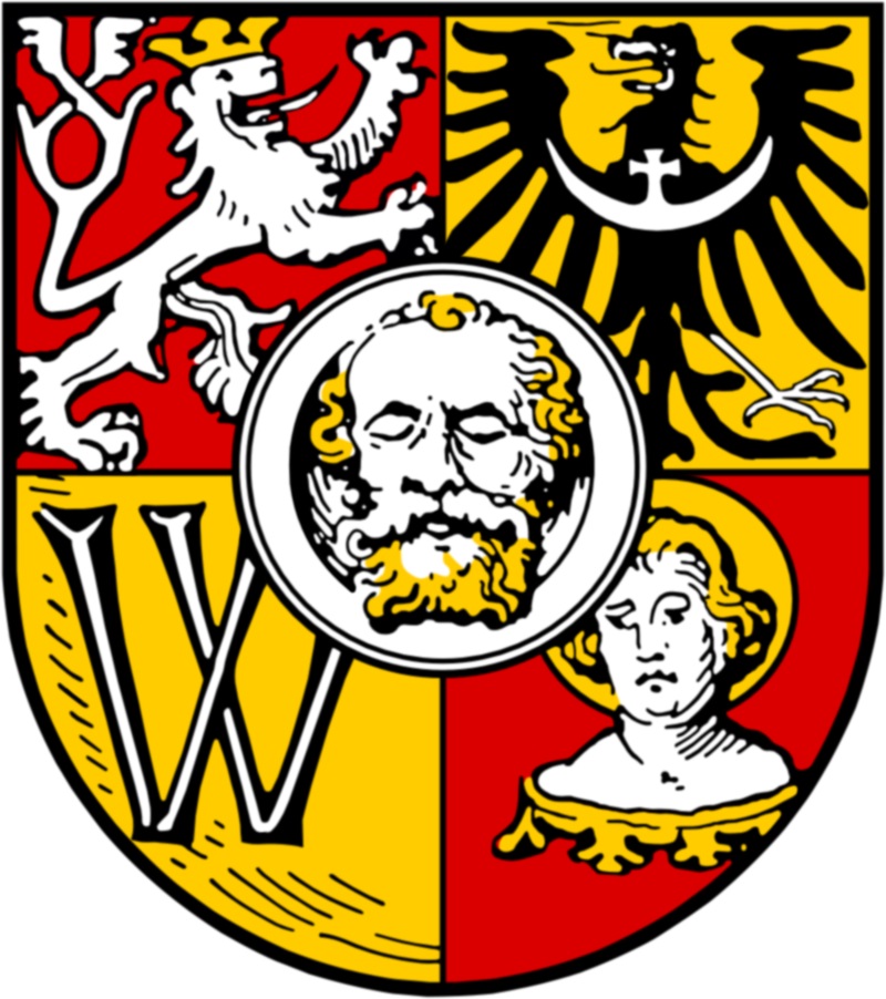 Современный герб Вроцлава состоит из пяти полей. В левом верхнем (геральдическом) углу на красном поле изображен коронованный Богемский лев, символ принадлежности бывшей Короны Королевства Богемия, в правом верхнем углу - черный Силезский орел (Згожелец) в золотое поле с белой полосой Генриха на груди и крыльях, увенчанное крестом. В правом нижнем углу на золотом поле - заглавная буква W от латинского названия города Вратиславия, в левом нижнем красном поле - бюст святого Иоанна Богослова (покровителя города). Заловая часовня) в нимбе, установленном на перевернутой короне (также принятой как голова святой Доротеи). В центре щита находится серебряная чаша с отрубленной головой святого Иоанна Крестителя, покровителя Вроцлавского собора.