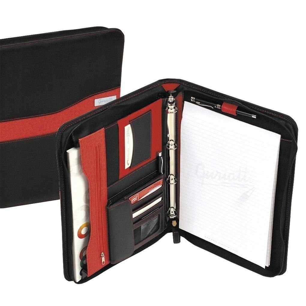Папка выполнена из черной эко-кожи, с красной фурнитурой, придающей ей динамичность. Он выглядит элегантно, его легко содержать в чистоте.