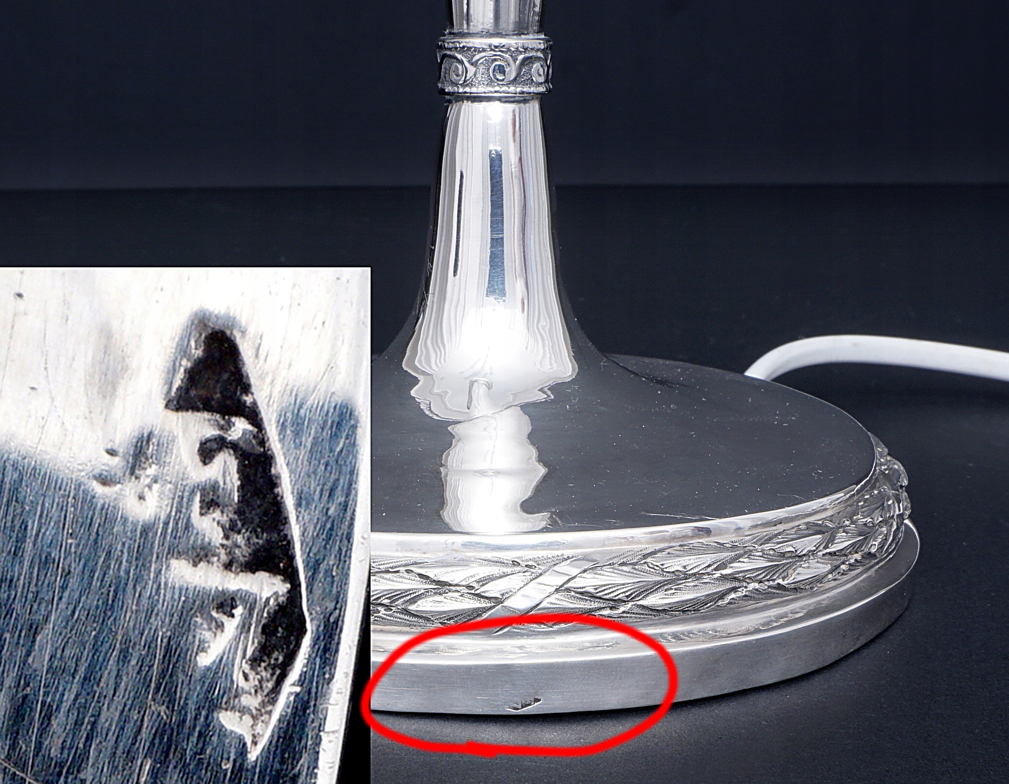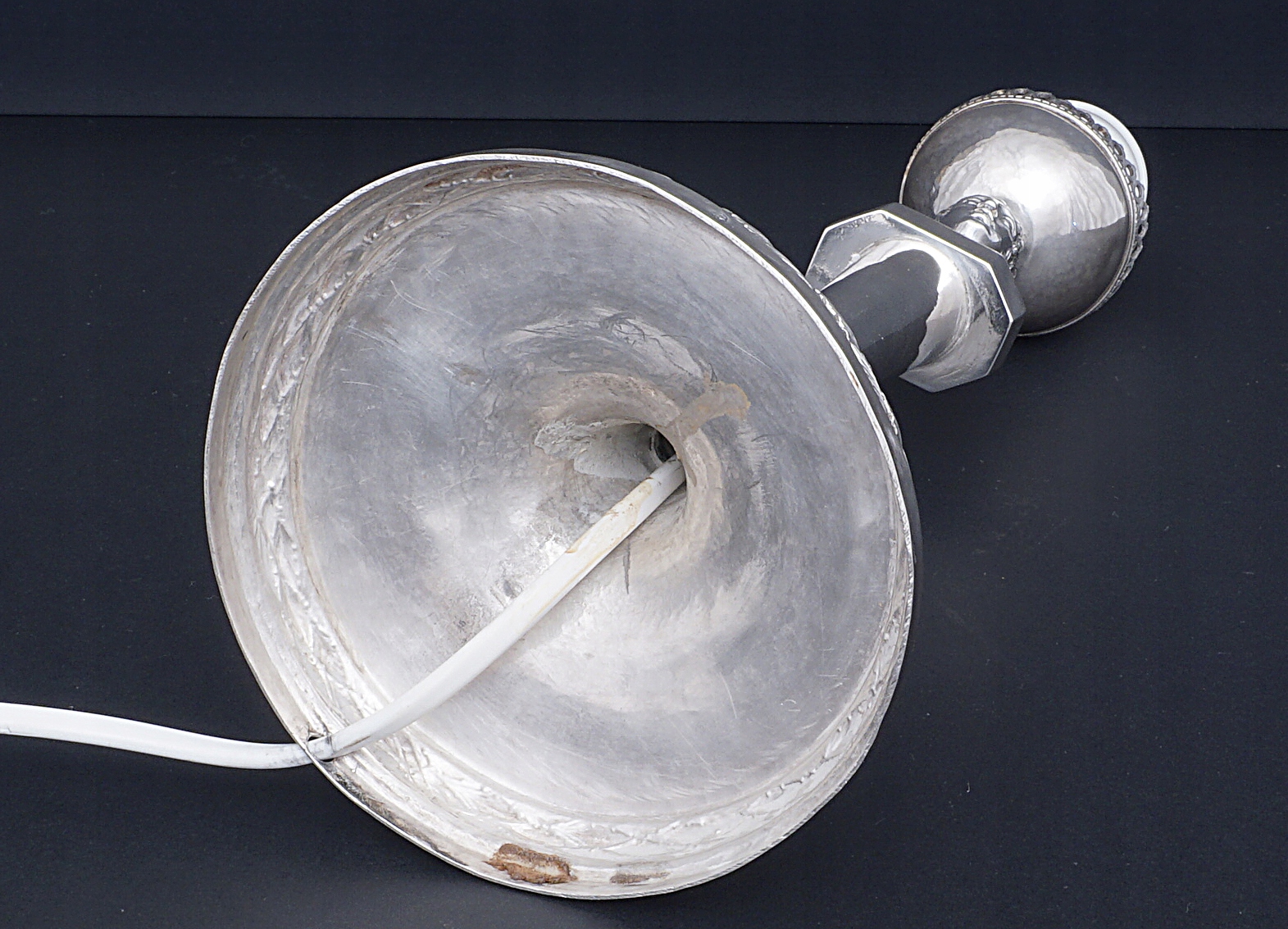 Серебряный чистый вес (без абажура и электрического оборудования) составляет 300 граммов. Он был взвешен перед установкой деталей для электричества.