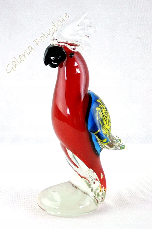 На стеклянной фигурке изображен красочный попугай из муранского стекла. Процесс изготовления венецианского стекла сложен. Изготовлен с использованием ламповой (в настоящее время горелки) технологии плавления кремнезема и последующей его формовки в процессе охлаждения массы, обладающей пластическими свойствами в определенном температурном диапазоне.