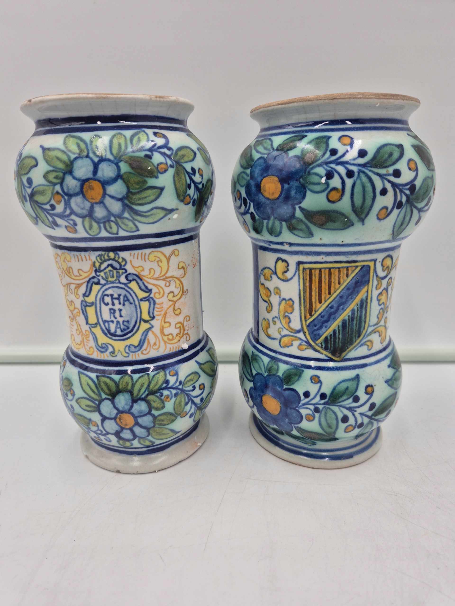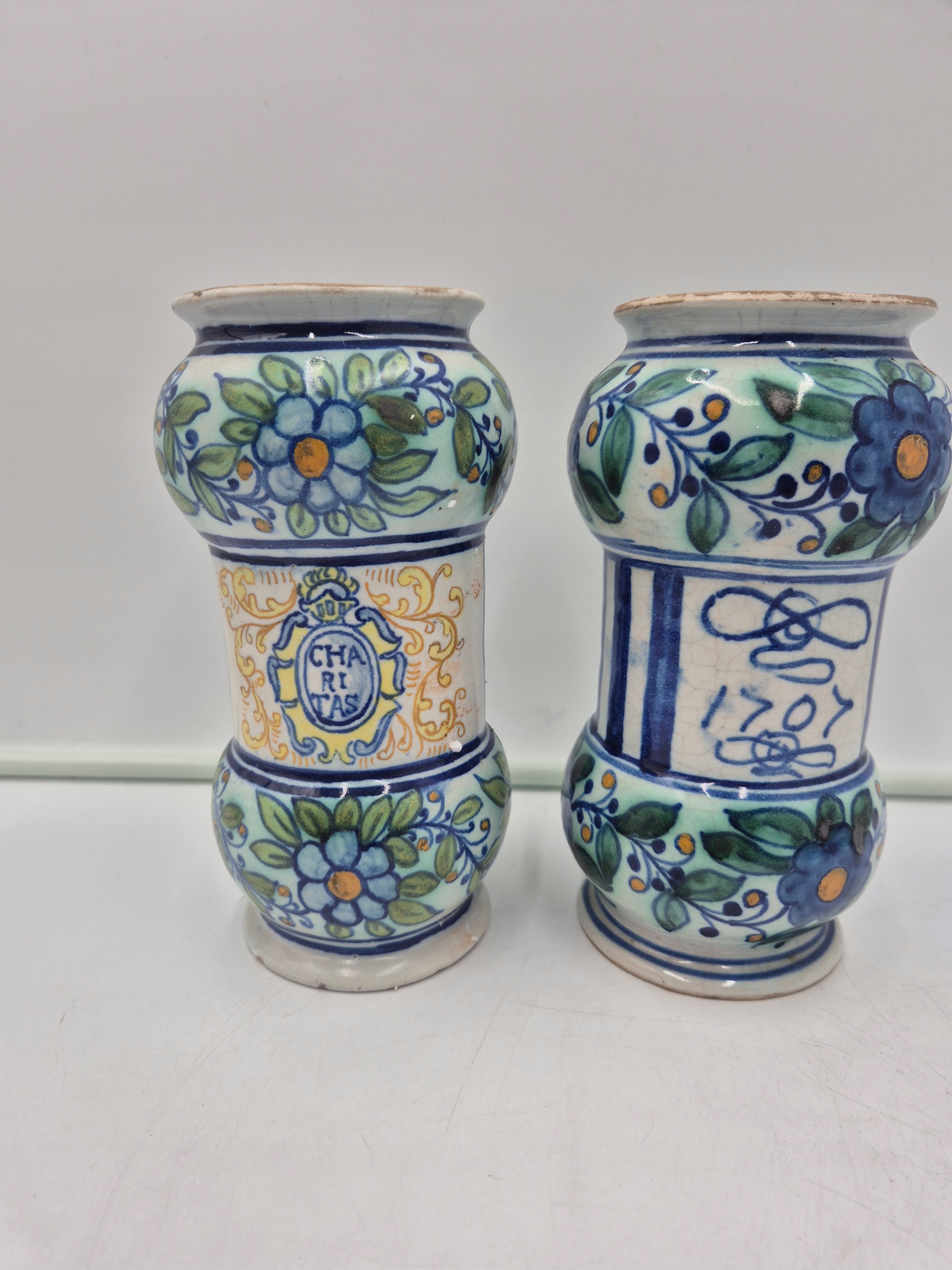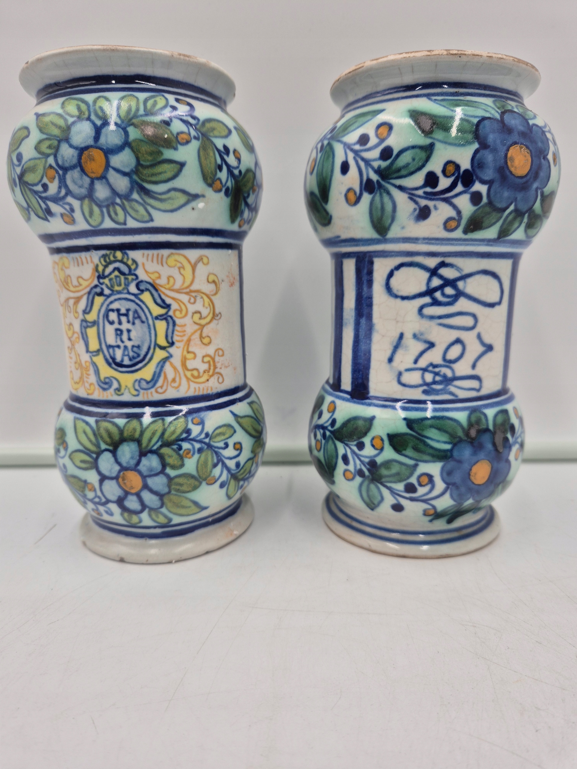 Пара аптечных контейнеров CHARITAS I из майолики, 1707 г., Франция, антиквариат.