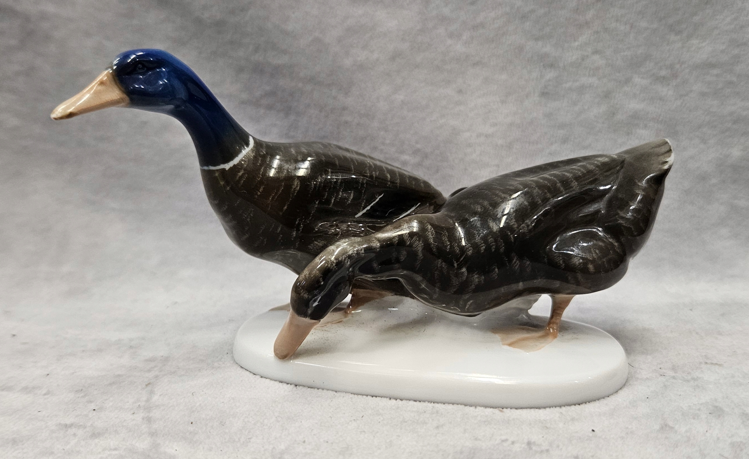 Пара уток Розенталя после 1910 года, дизайн Карла ХИММЕЛЬСТОССА (1878 Вроцлав - 1967 Мюнхен) Пара селезня и утки, глазурованный фарфор, подглазурная роспись, размеры 14х7 см. Клеймо производителя внизу: Korona/Rosenthal/Selb-Bavaria, покраска. К.ХИММЕЛЬСТОСС, массовое впечатление: К.153. Розенталь по проекту Карла ХИММЕЛЬСТОССА (1878 Вроцлав - 1967 Мюнхен)