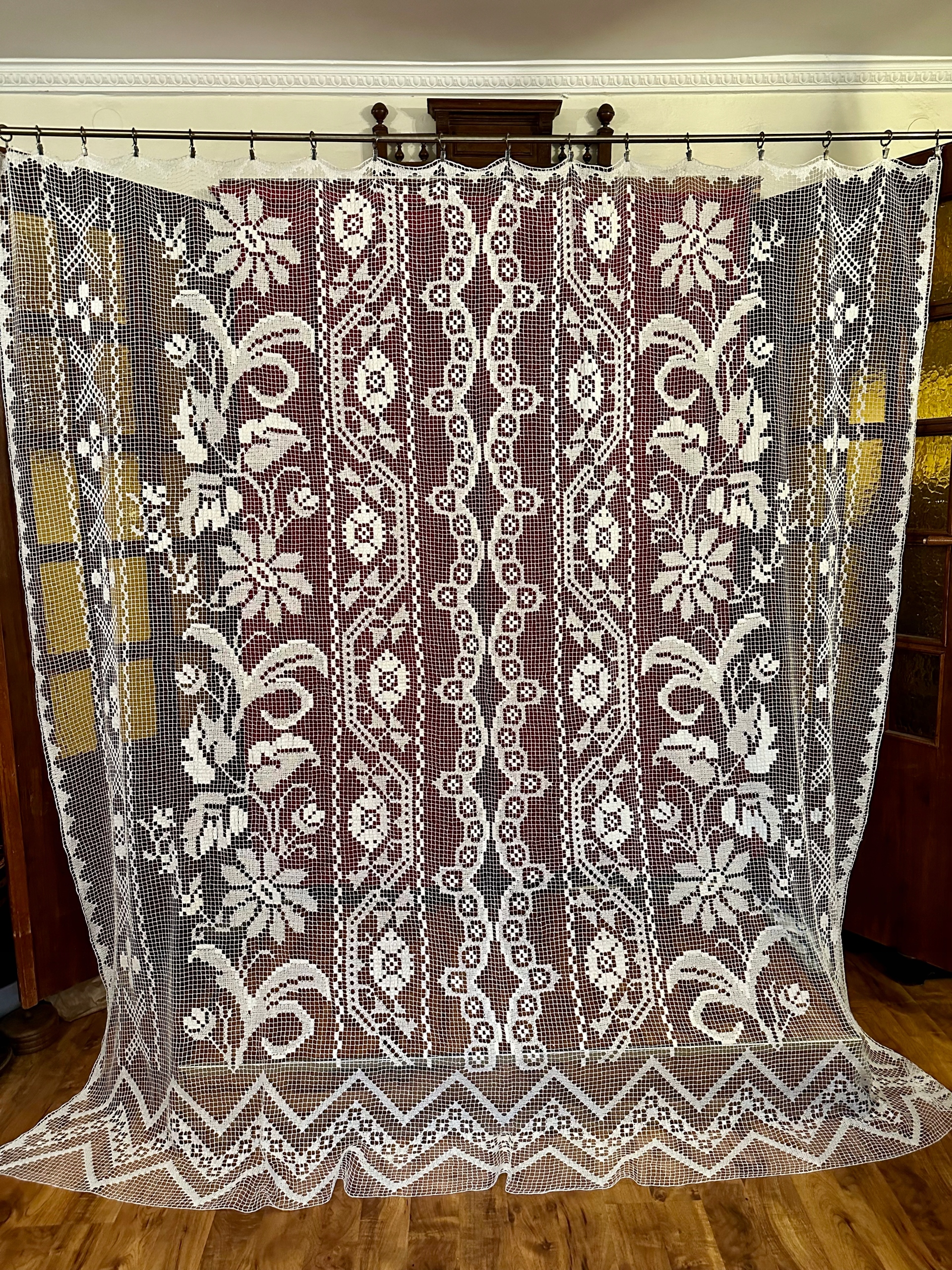 Две одинаковые, исключительно красивые шторы, выполненные вручную в филейной технике (вышивка по сетке). Несмотря на время, он находится в очень хорошем состоянии. Хлопковые нити. Цвет светлый экрю.