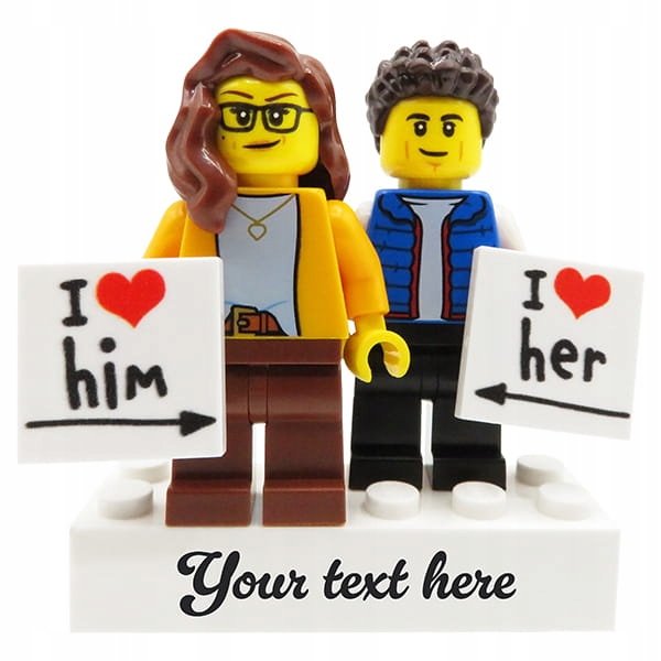 Персонализированные фигурки создаются только из новых и оригинальных частей LEGO. Таким образом, они имеют размер стандартных людей Lego (высота 4 см). Люди будут размещены на белом блоке Lego (высота 1 см), покрытый прозрачной наклейкой с печатным текстом. Белая плитка Lego с нашим оригинальным принтом «Я люблю его / люблю ее», будет положена в руки фигур. Персонализированные люди будут упакованы в декоративную, материальную сумку для органзы - как раз к подарочному подарку! Приветствующая карта также будет прикреплена к фигуркам, на которой вы можете написать любые пожелания.