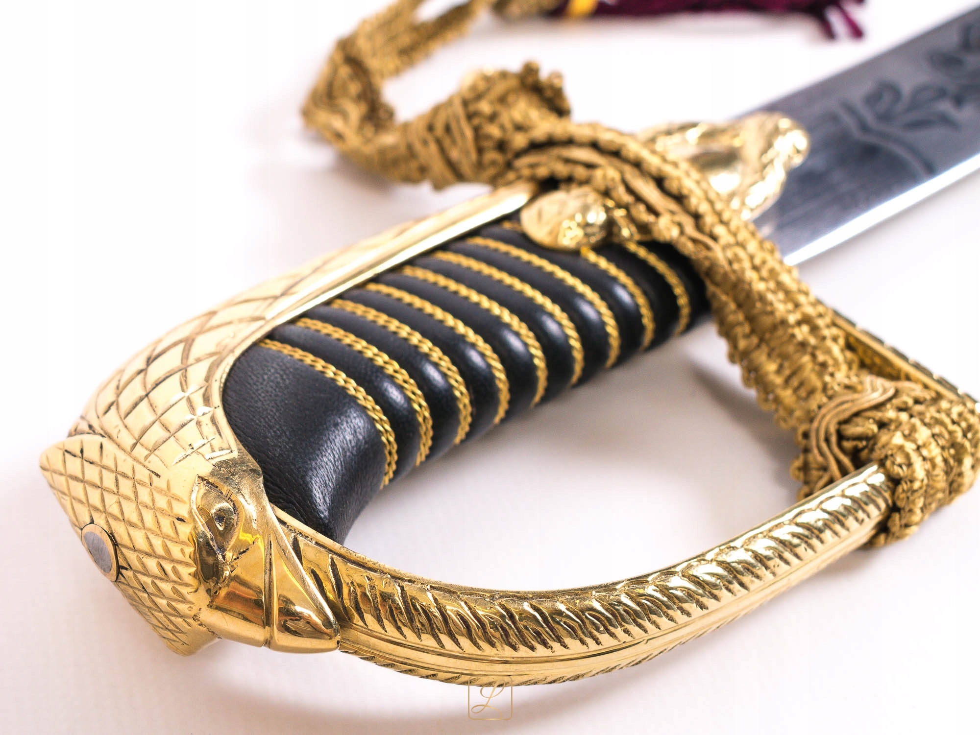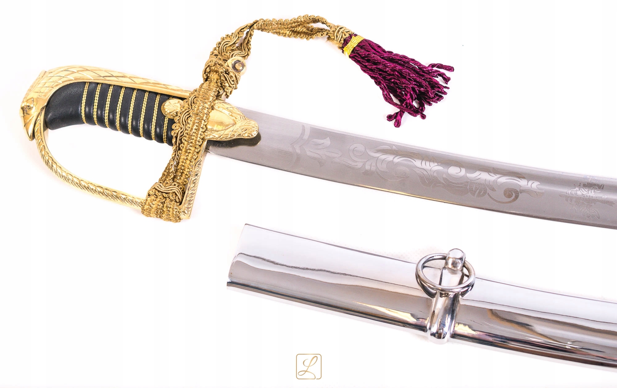 Сабля с парадом, украшенная ручка, поддерживаемая как шаблон ручки сабля 1921/22. Деревянная ручка, покрытая черной кожей. Видимые ноты, заполненные латунными скручиваемыми проволоками, так называемые корпус. Голова ручки имеет вид головы орла, а крышка покрыта украшением перья. Triplifilic Brass Jelec с усами. Высококачественное стальное лезвие не закаленное, хранится в полуматте. На внешней амфибии красивое пищеварение: среди цветочных мотивов надпись "Боже честь родина" . Декоративная стропа, привязанная к ручке из материала, золотая лента закончилась красным краном. Олово, хром, с одним рисом и подвижным коллапсом, заканчивался брызги. Варианты доступны в «Купить вместе» выше описания.